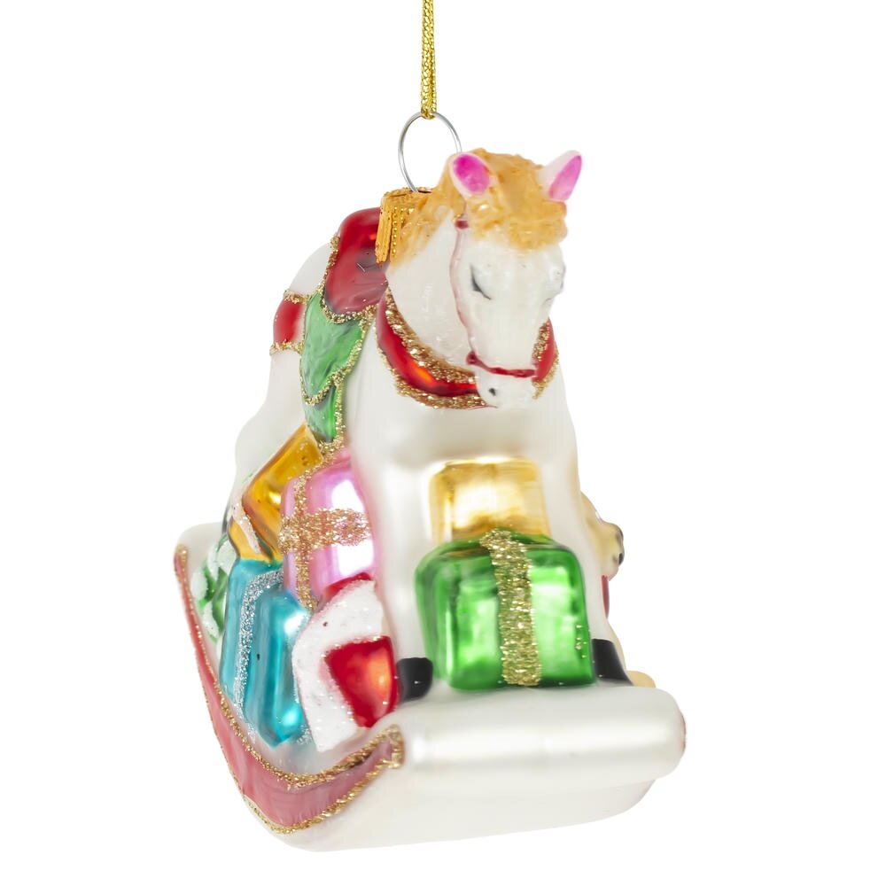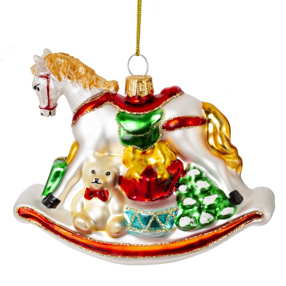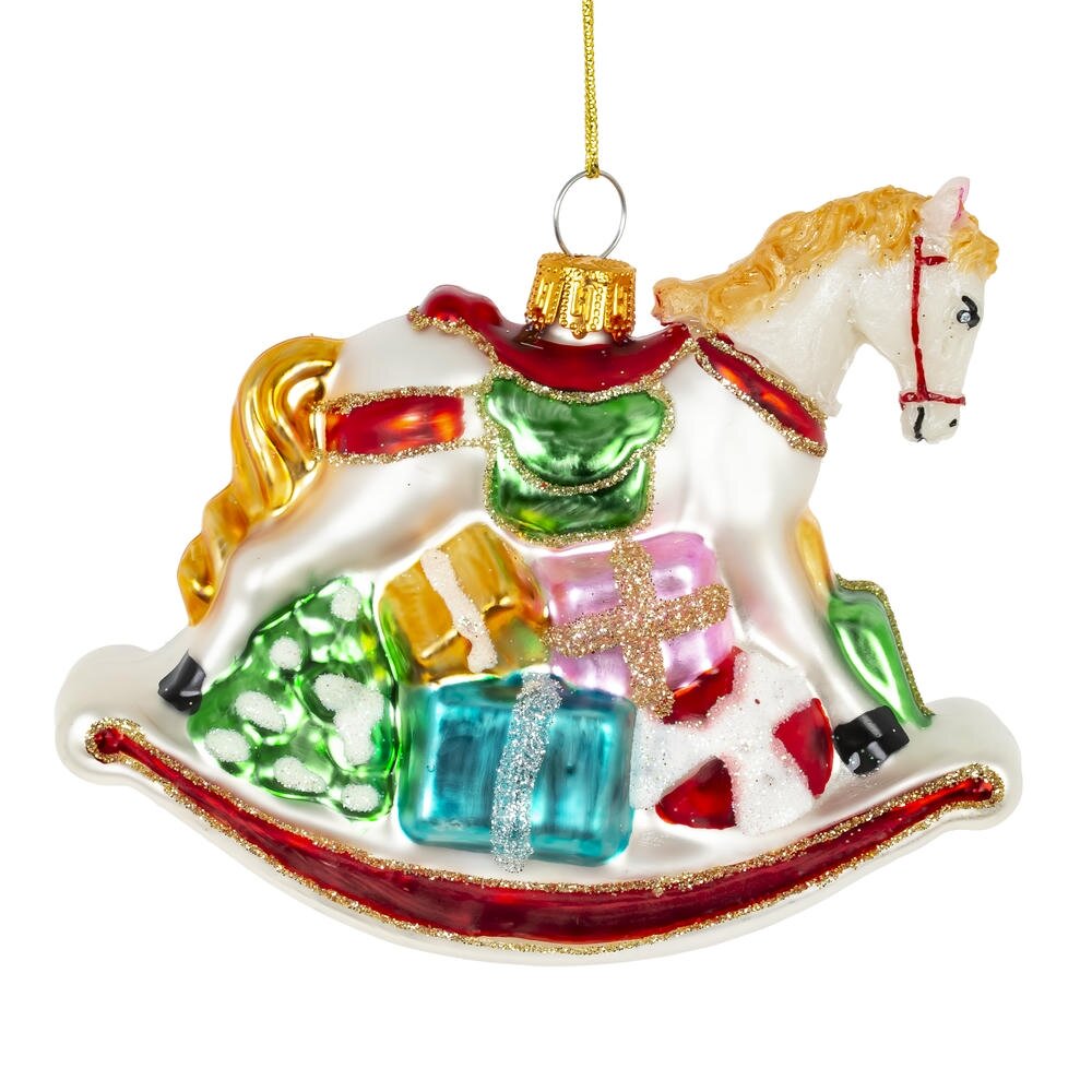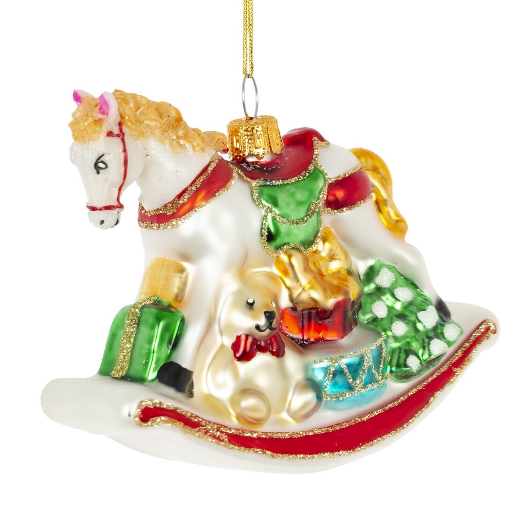 Ёлочное украшение из стекла «Лошадка-качалка с подарками» — изысканное и трогательное дополнение к новогоднему декору. Выполненное вручную из тонкого стекла, оно поражает детализацией и изяществом форм. Фигурка лошадки-качалки украшена миниатюрными подарками, символизируя радость, волшебство и праздничное ожидание. Яркие краски и блестящие акценты делают украшение заметным и нарядным, а стеклянная фактура добавляет лёгкости и элегантности. Идеально сочетается с классическим новогодним оформлением, создавая атмосферу тепла и уюта. Такое украшение станет настоящей жемчужиной на ёлке и запоминающимся подарком для близких.