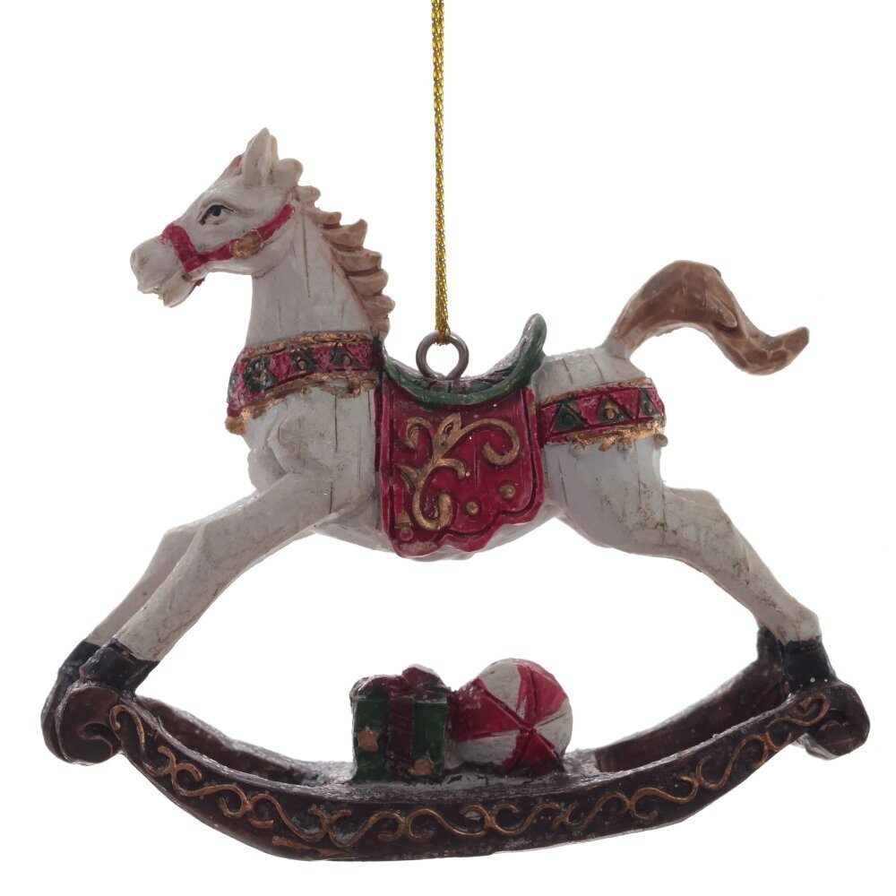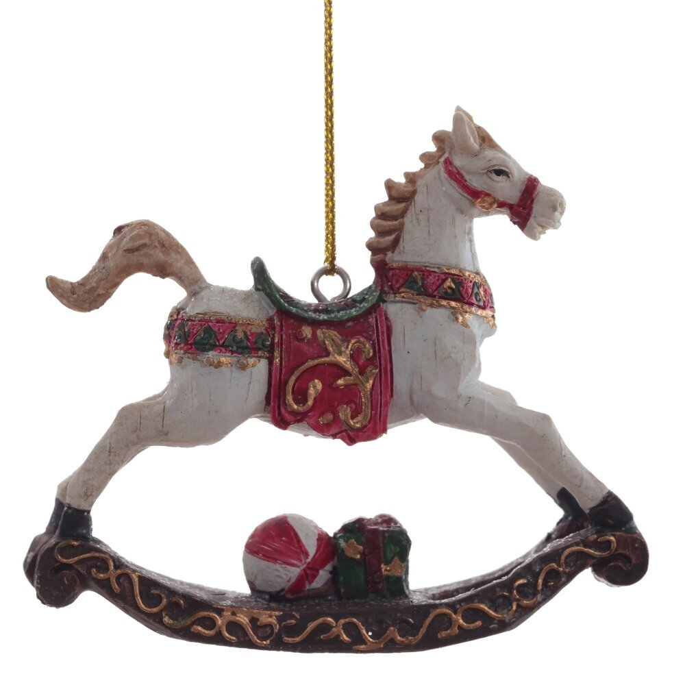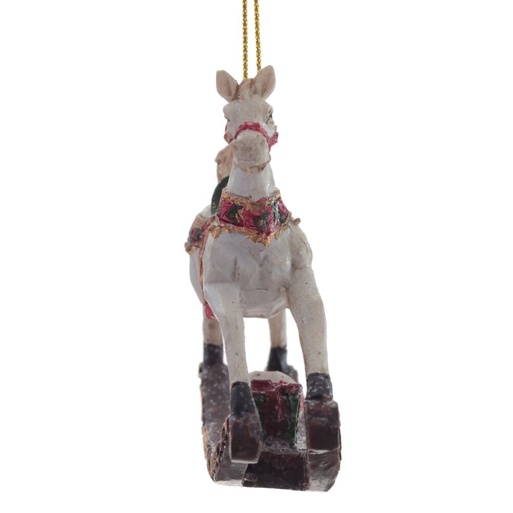 Лошадка-качалка - это символ детства, чуда, праздника и чего-то светлого и доброго. Наша декоративная подвесная лошадка-качалка выполнена из полистоуна, в белом цвете. Она украшена красной амуницией с золотыми вензелями. Эта елочная игрушка придаст елочке уникальность и неповторимость, а так же станет прекрасным подарком на Новый год и Рождество.