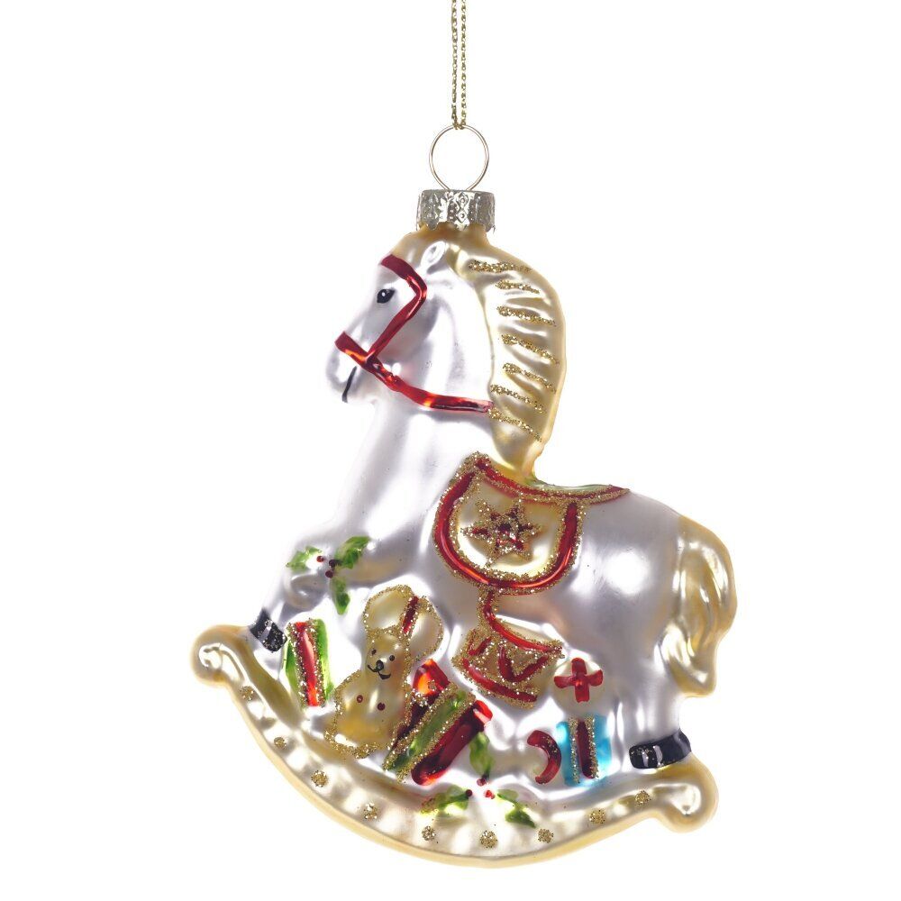 Очаровательное ёлочное украшение из стекла в виде лошадки-качалки станет ярким акцентом в праздничном оформлении. Выполненное в традиционной красно-белой гамме, оно навевает тёплые воспоминания о детстве и классическом Рождестве. Украшение дополнено изысканным декором из золотистых блесток, которые придают ему праздничное сияние и эффект волшебства. Детализированная прорисовка делает лошадку выразительной и по-настоящему нарядной. Лёгкая, но прочная стеклянная конструкция прекрасно смотрится на ветвях ели, в новогодних композициях или как часть коллекционного декора. Идеально сочетается с другими игрушками в винтажном и традиционном стиле.