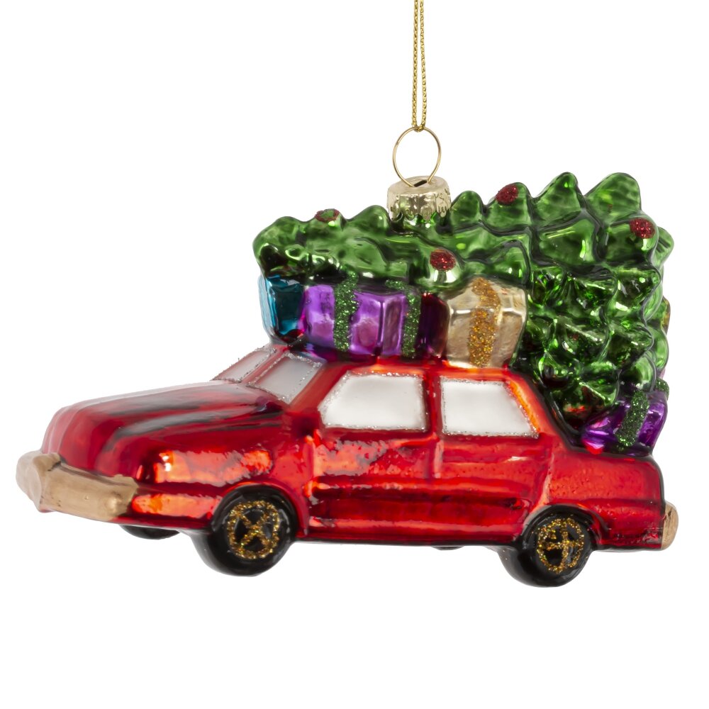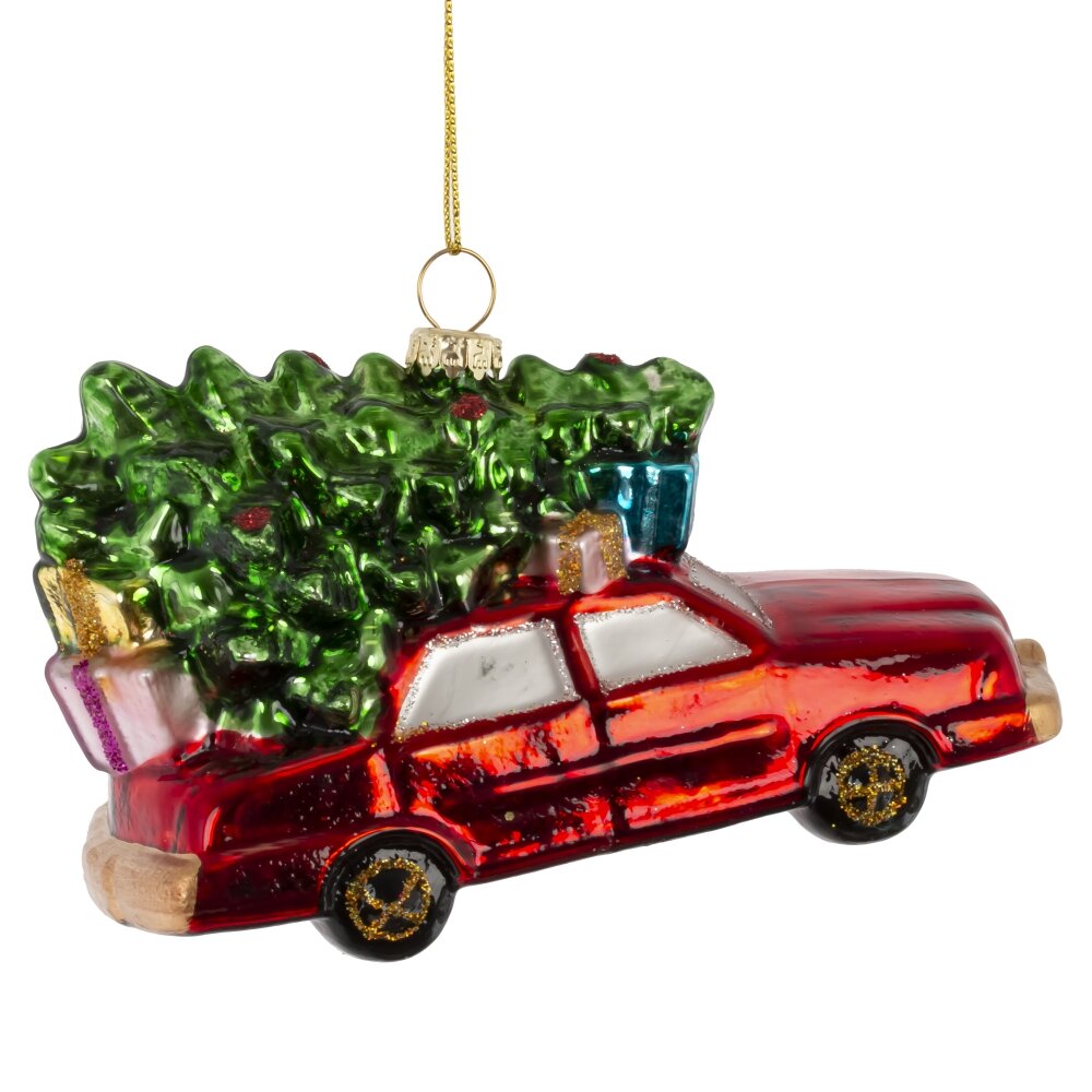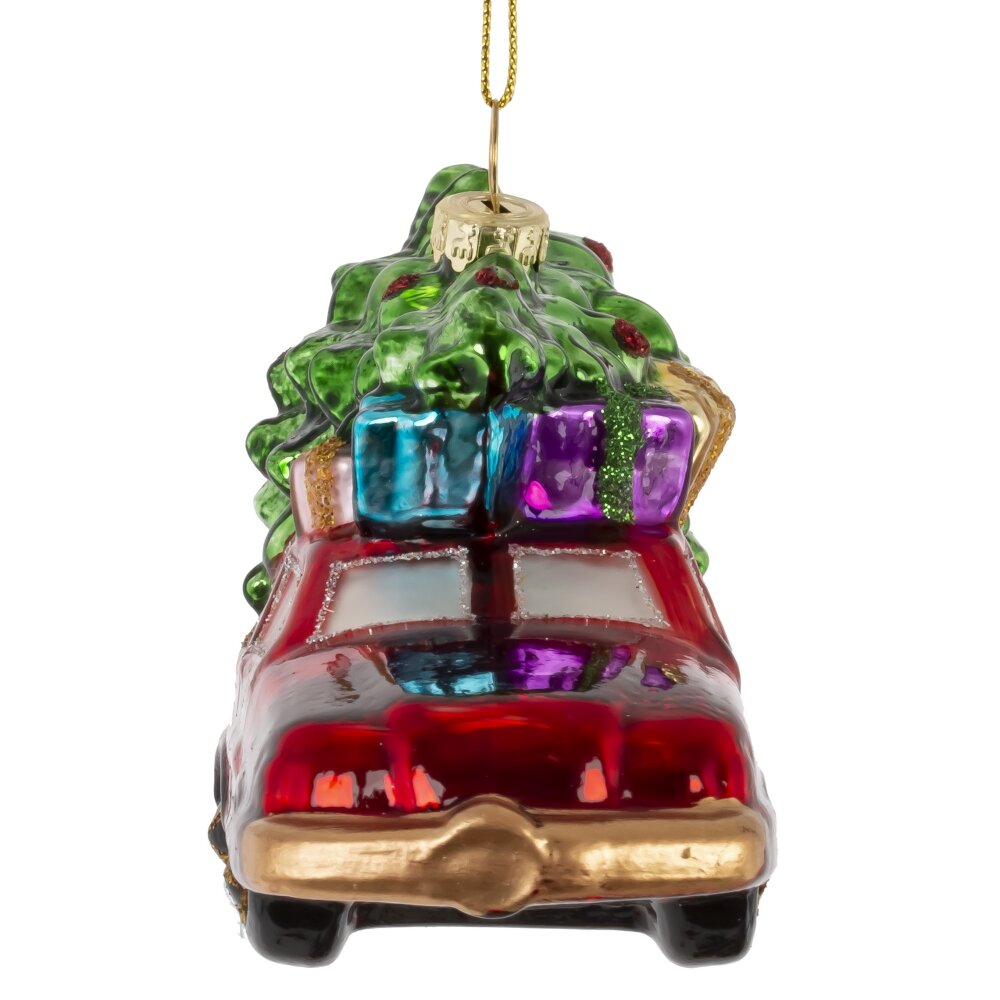 Яркое и ностальгическое украшение из стекла — красная машина с пушистой ёлкой на крыше — воплощает атмосферу настоящего семейного праздника. Игрушка выполнена с тонкой проработкой деталей: блестящая поверхность кузова, сияющие элементы декора и реалистичная ёлочка создают эффект тёплого новогоднего путешествия. Мерцающий шиммер добавляет волшебства, отражаясь в огоньках гирлянд. Эта стеклянная фигурка станет ярким акцентом на вашей ёлке, вызывая улыбку и создавая ощущение уюта, радости и приближающегося чуда. Идеальный выбор для тех, кто ценит традиции и душевный праздничный декор.