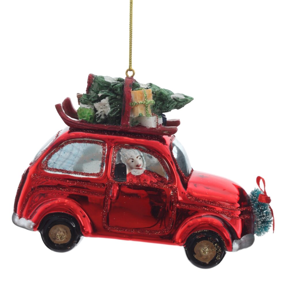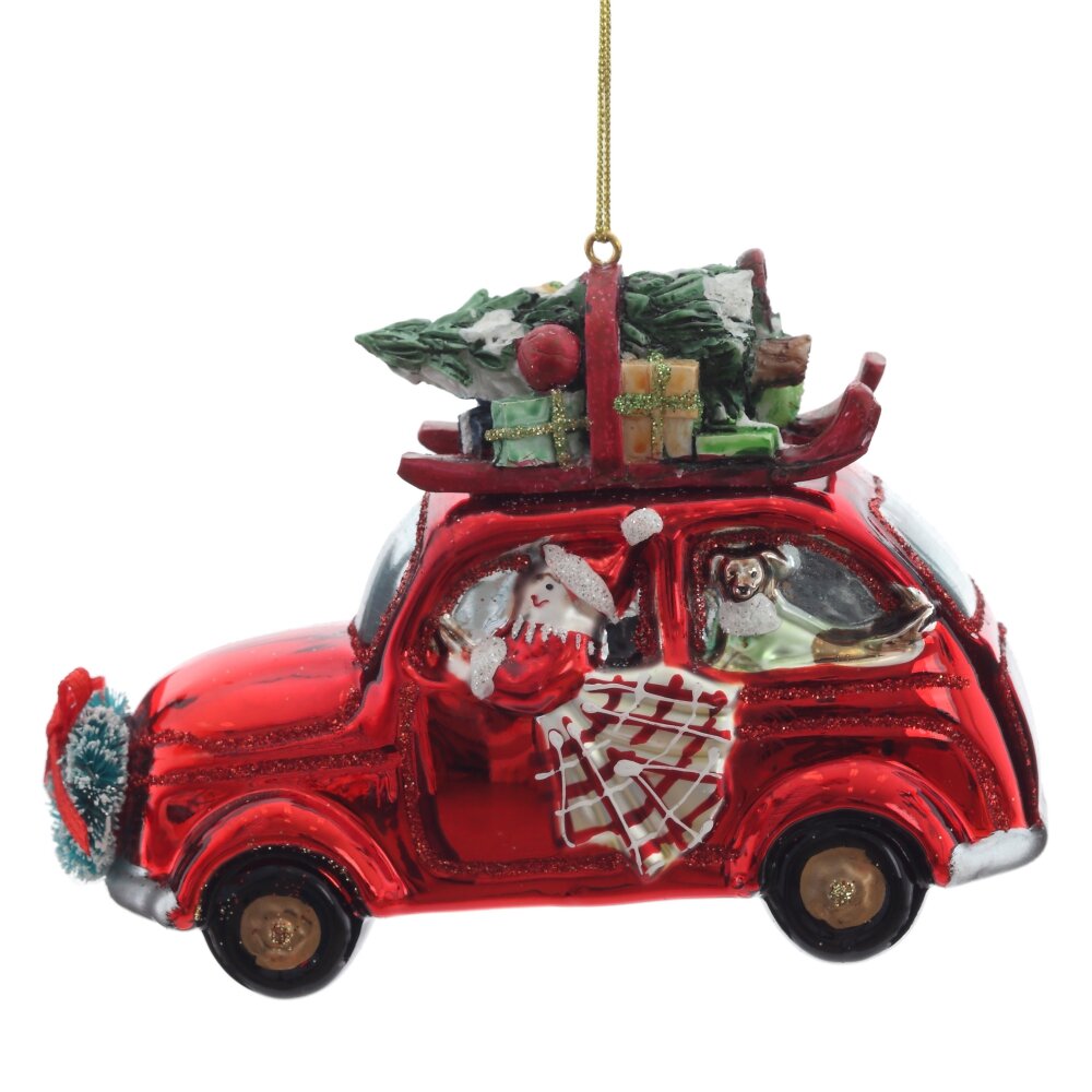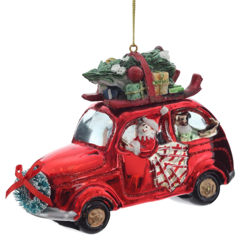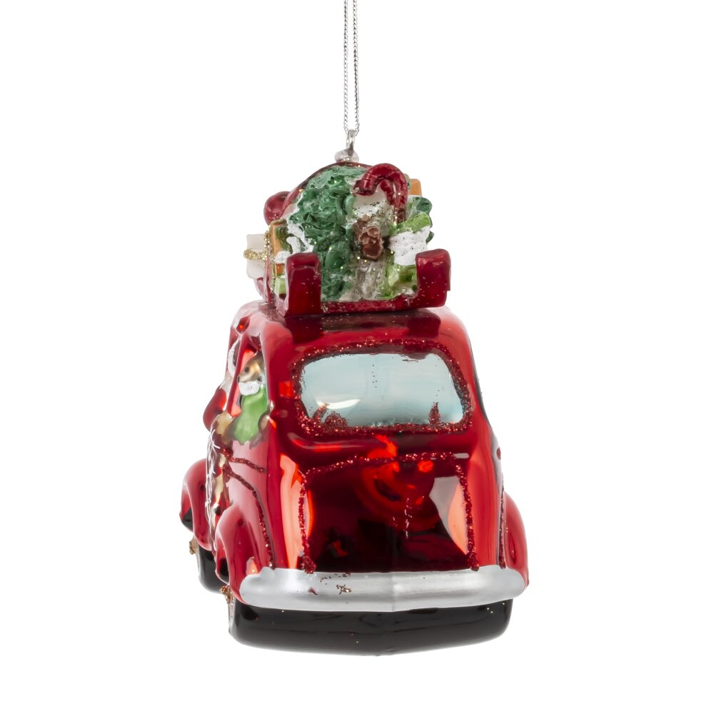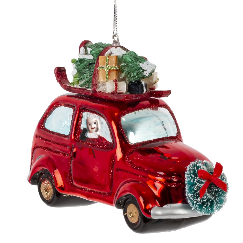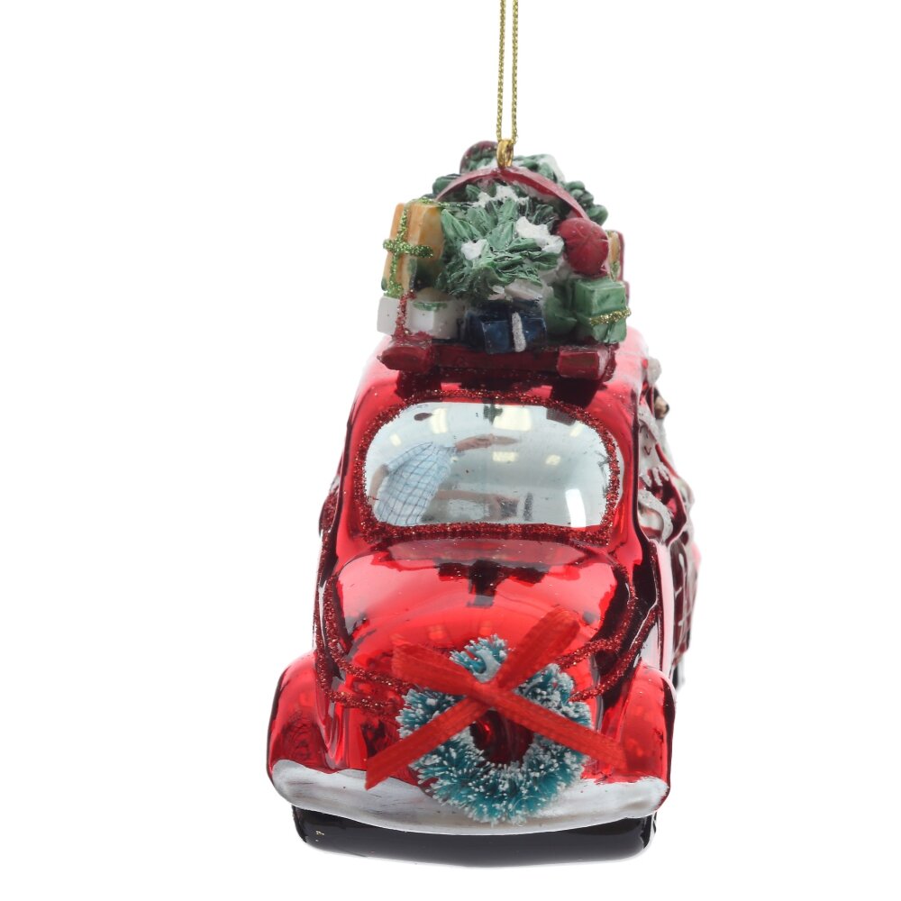 Очаровательное ёлочное украшение из стекла — красный ретро-автомобиль с Дедом Морозом за рулём и праздничным грузом на крыше — настоящая сказка в миниатюре. Яркий автомобиль блестит глянцевым красным цветом, украшен мерцающим шиммером, а на его крыше уютно устроились пушистая ёлочка и новогодние подарки. Фигурка выполнена с тонкой прорисовкой деталей: борода Деда Мороза, сверкающие колёса, рождественские украшения — всё создаёт атмосферу волшебства и ожидания чуда. Это украшение не только украсит ёлку, но и подарит радость, тепло и ощущение приближающегося праздника. Идеально для семейного декора или в подарок с душой!