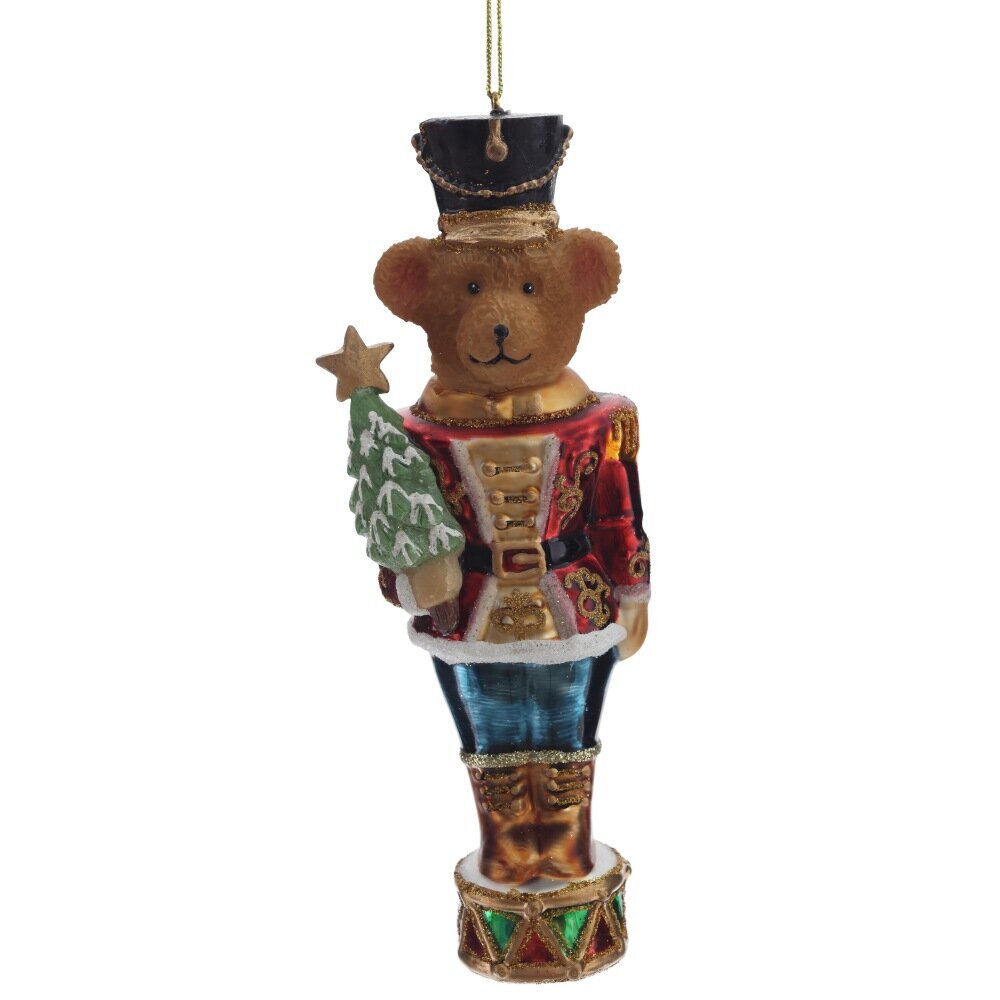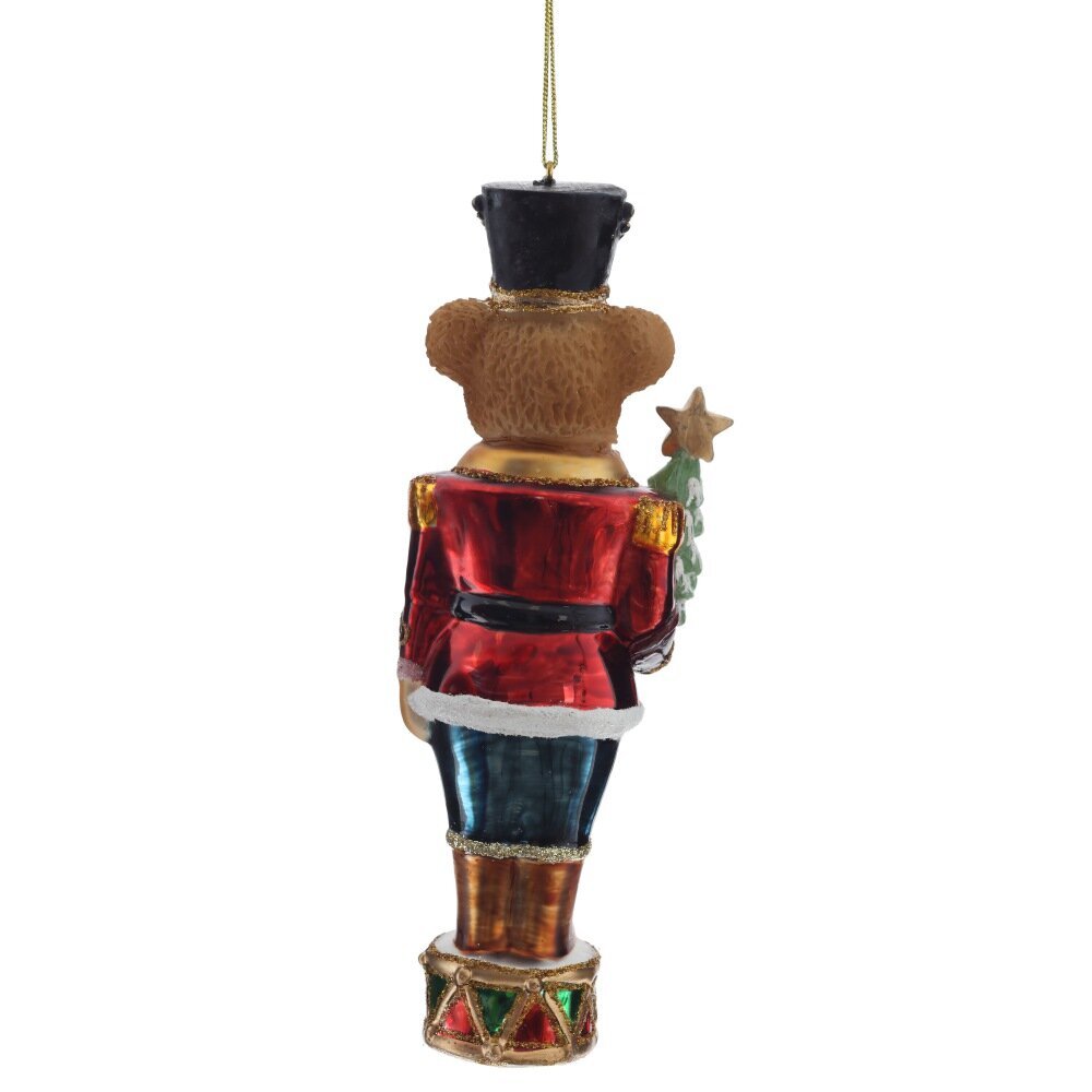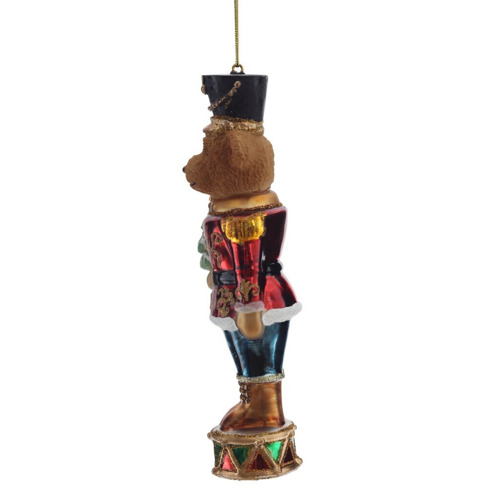 Ёлочное украшение в виде медвежонка-солдатика выполнено из высококачественного стекла с тщательной проработкой деталей. Медвежонок одет в яркую форменную одежду с золотистыми элементами, что придаёт игрушке торжественный и сказочный вид. Его милое выражение лица и блестящая отделка создают ощущение уюта и волшебства, характерного для новогодних праздников. Такое украшение не только украсит ёлку, но и добавит в интерьер нотку классической рождественской сказки. Медвежонок-солдатик станет прекрасным подарком и достойным украшением коллекции стеклянных игрушек.