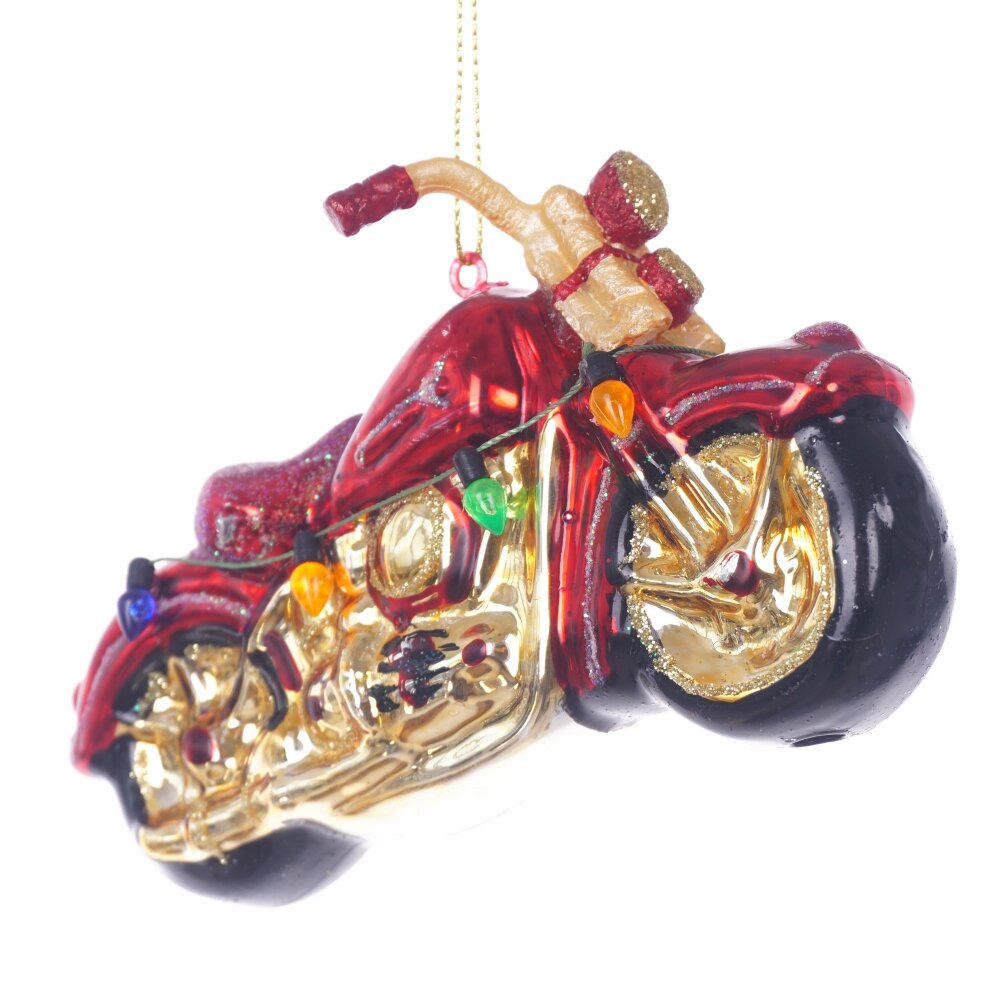 Эффектное ёлочное украшение из стекла — мотоцикл — станет ярким и смелым акцентом вашего новогоднего декора. Фигурка выполнена с высокой детализацией: от блистательной металлической рамы до изящно проработанных колёс и руля. Глянцевая поверхность, яркие цвета и мерцающий шиммер делают украшение особенно выразительным в свете гирлянд. Мотоцикл символизирует свободу, движение и стремление вперёд — именно то, чего так хочется в новом году. Идеально подойдёт для любителей скорости, байкеров или просто поклонников оригинальных, нестандартных праздничных акцентов.