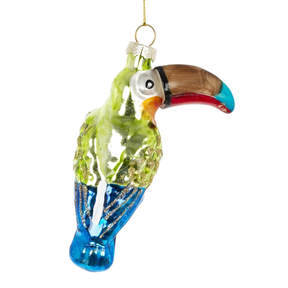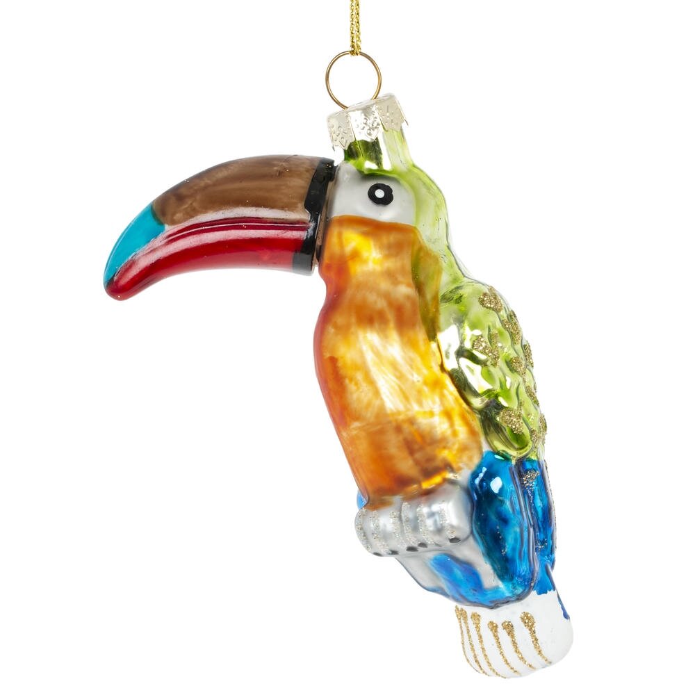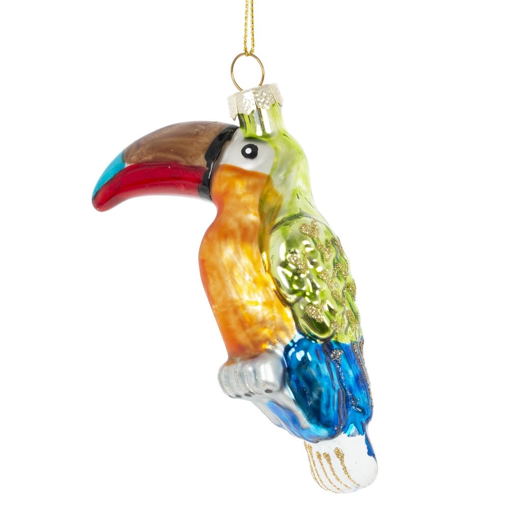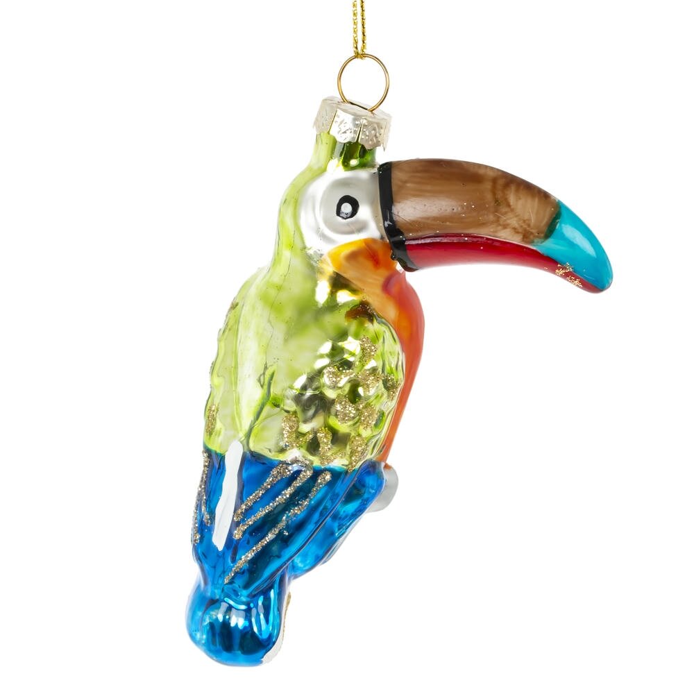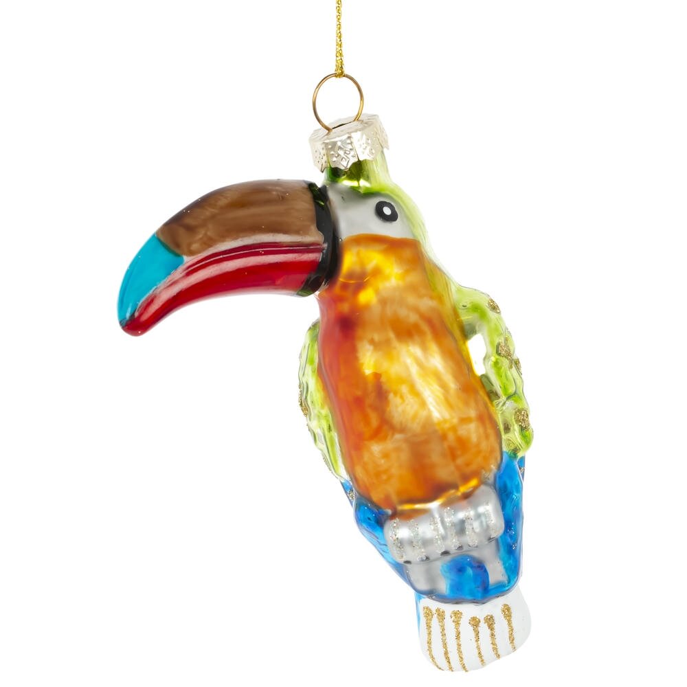 Это яркое стеклянное новогоднее украшение в виде тукана станет эффектным акцентом на вашей праздничной ёлке. Фигура выполнена из высококачественного стекла и украшена детальной росписью, которая подчёркивает изящные контуры птицы и её выразительный клюв. Яркий цвет тукана придаёт изделию теплоту и живость, создавая ощущение радости и праздничного настроения. Поверхность украшения украшена лёгким блеском, что придаёт ему дополнительное сияние и подчёркивает праздничную атмосферу. Благодаря своему необычному образу, это украшение отлично впишется в любой новогодний декор, привнося экзотический и стильный штрих. Тукан из стекла — это не просто украшение, а символ уникальности и красоты, который станет любимым элементом вашей коллекции и подарит радость на многие зимние праздники.