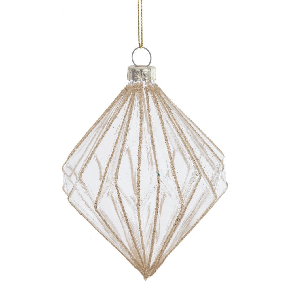 Елочное украшение из стекла в виде объемного ромба с золотистыми линиями - изысканный декор для праздничной елки. Прозрачное стекло создает игру света и тени, а золотистые грани добавляют элегантности. Такое украшение подчеркнет вкус и стиль вашего новогоднего интерьера, придавая праздничное сияние и блеск.