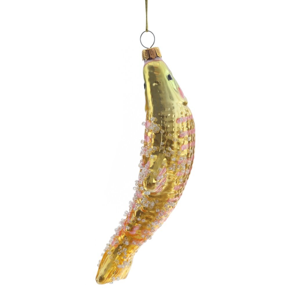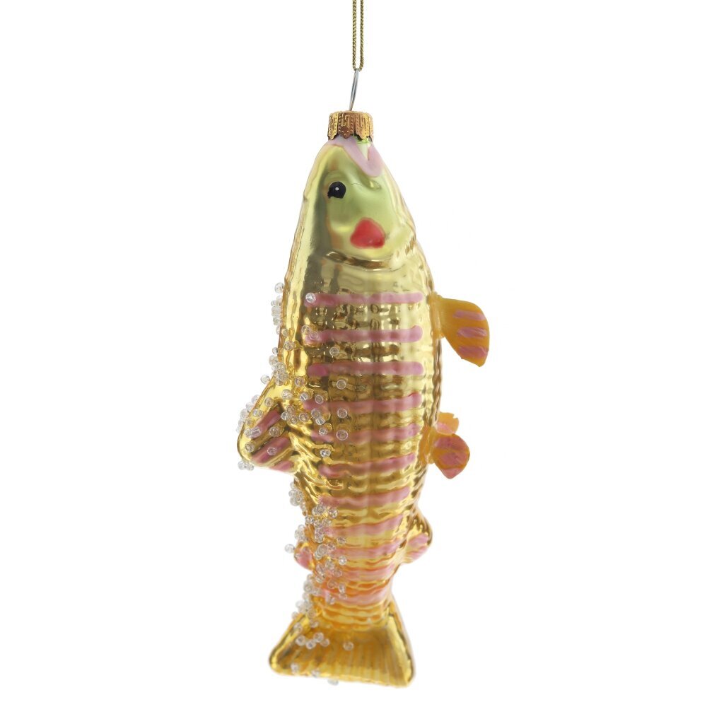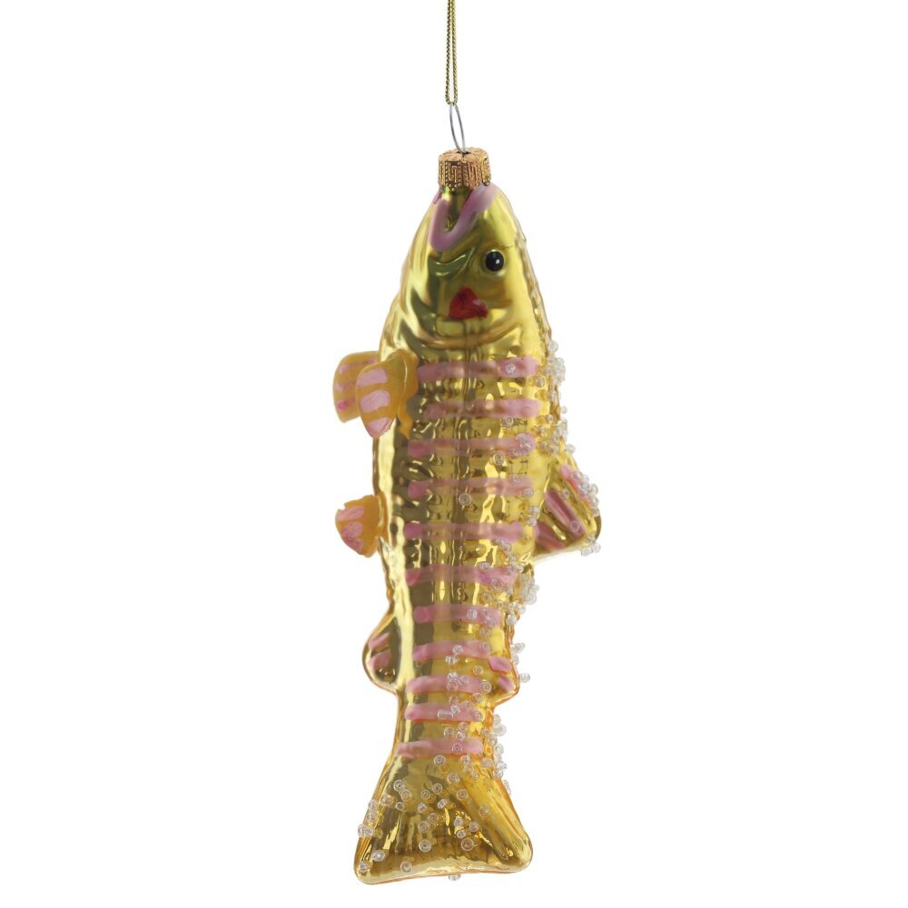 Уникальное елочное украшение из стекла — рыба, выполненная в изысканных бело-золотых тонах, украшенная нежным бисером и мерцающим шиммером — станет настоящим украшением вашей новогодней ёлки. Тонкая работа подчёркивает плавные линии и изящные детали, придавая фигурке лёгкость и утончённость. Блестящие элементы переливаются в свете гирлянд, создавая волшебную игру света и создавая атмосферу роскоши и праздника. Такое украшение идеально впишется в стильный, элегантный декор и станет эффектным акцентом, который привлечёт внимание и подарит радость в зимние праздники.