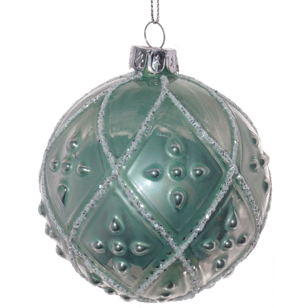Стеклянный шар выполнен в традиционном праздничном стиле. Глянцевая поверхность и изящные узоры придают этому шару особую изысканность.