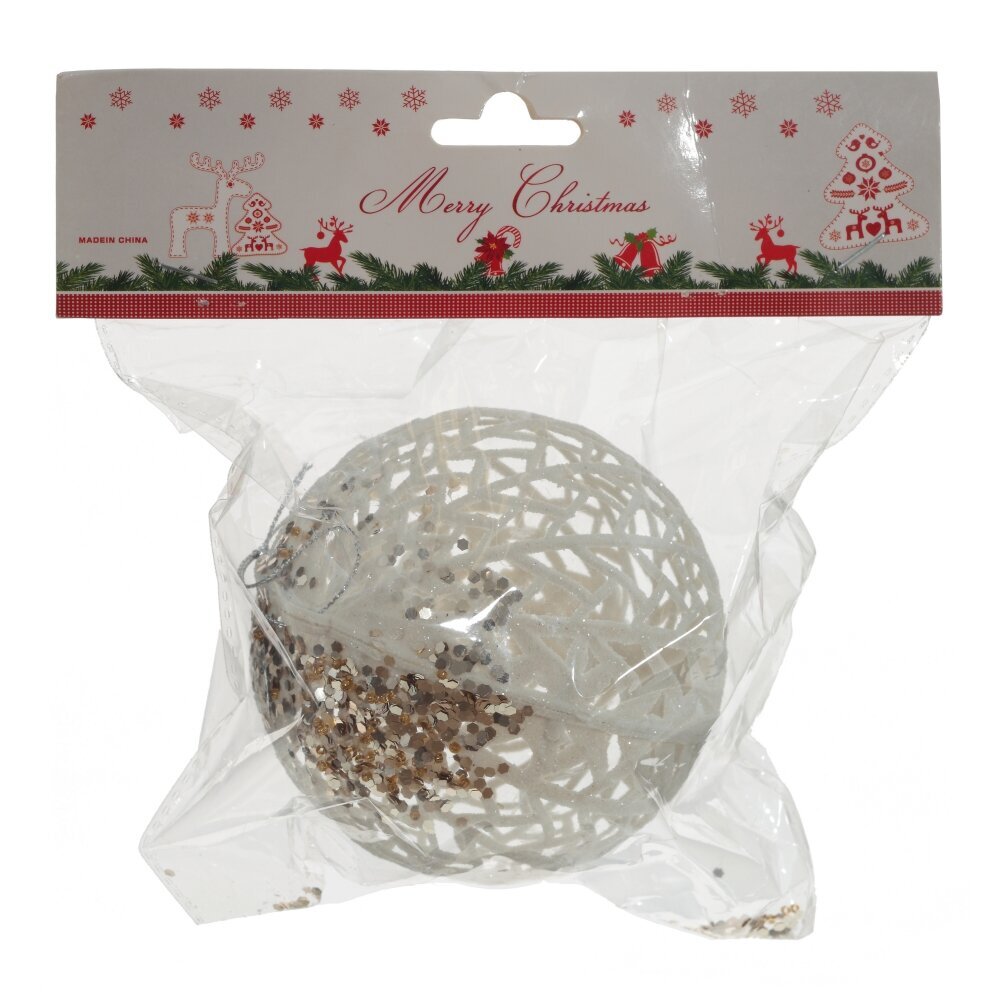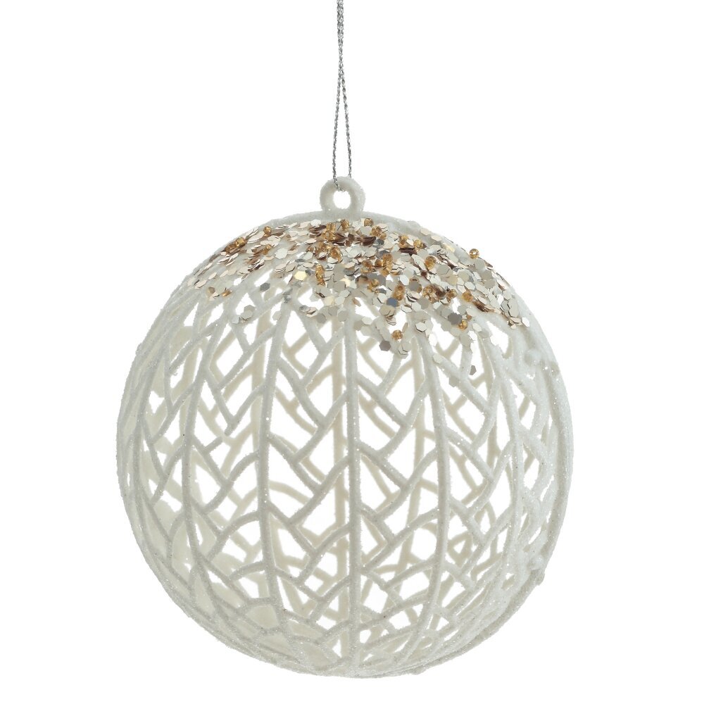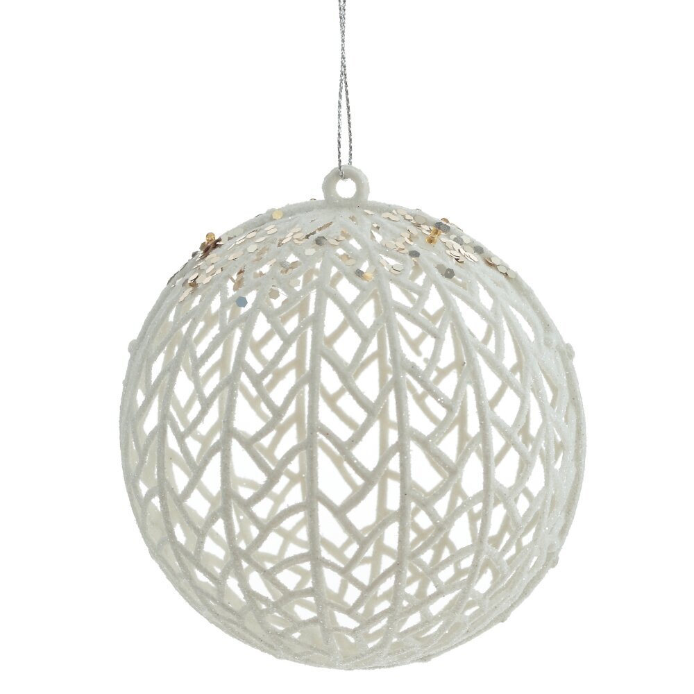 Ажурный шар белого цвета с искристым напылением. Глиттер придает украшению яркости и блеска. Великолепно гармонирует с любым убранством новогодней ели.