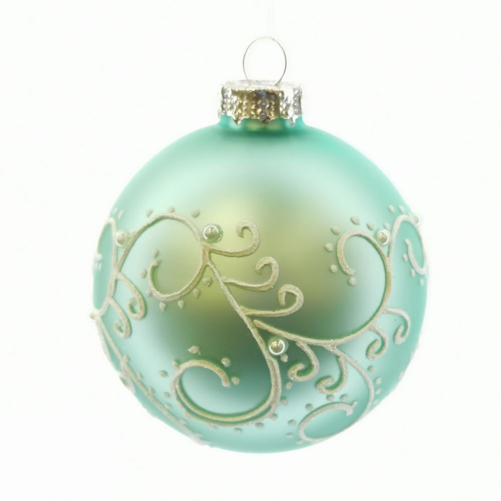 Стеклянный шар выполнен в традиционном праздничном стиле. Глянцевая поверхность и изящные узоры придают этому шару особую изысканность.