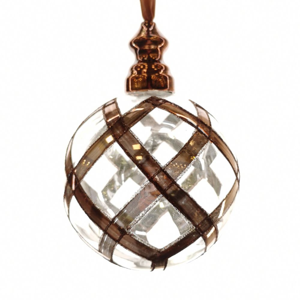 Стеклянный шар выполнен в традиционном праздничном стиле. Прозрачность и изящные линии придают этому шару особую изысканность.