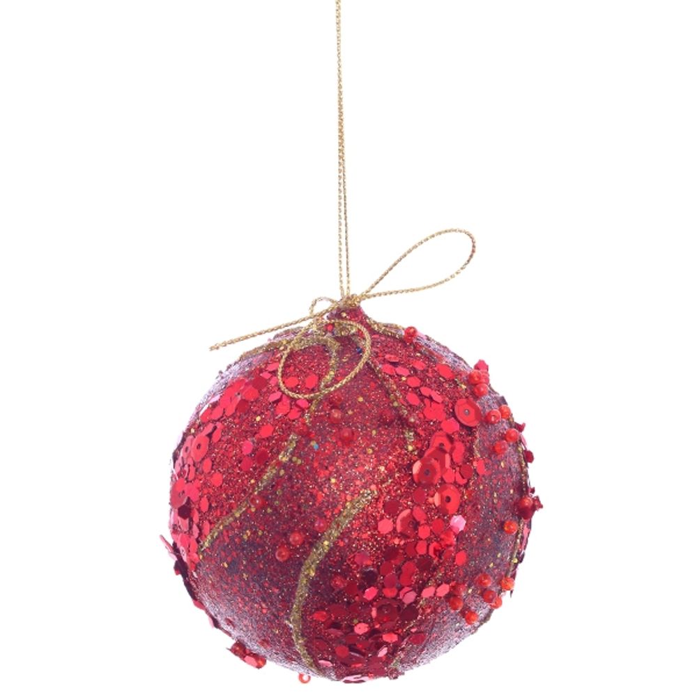 Новогодний яркий елочный шар, украшенный пайетками, изготовлен из полимерных материалов. Непременно порадует вас своим изяществом и прекрасно дополнит праздничный наряд лесной красавицы.