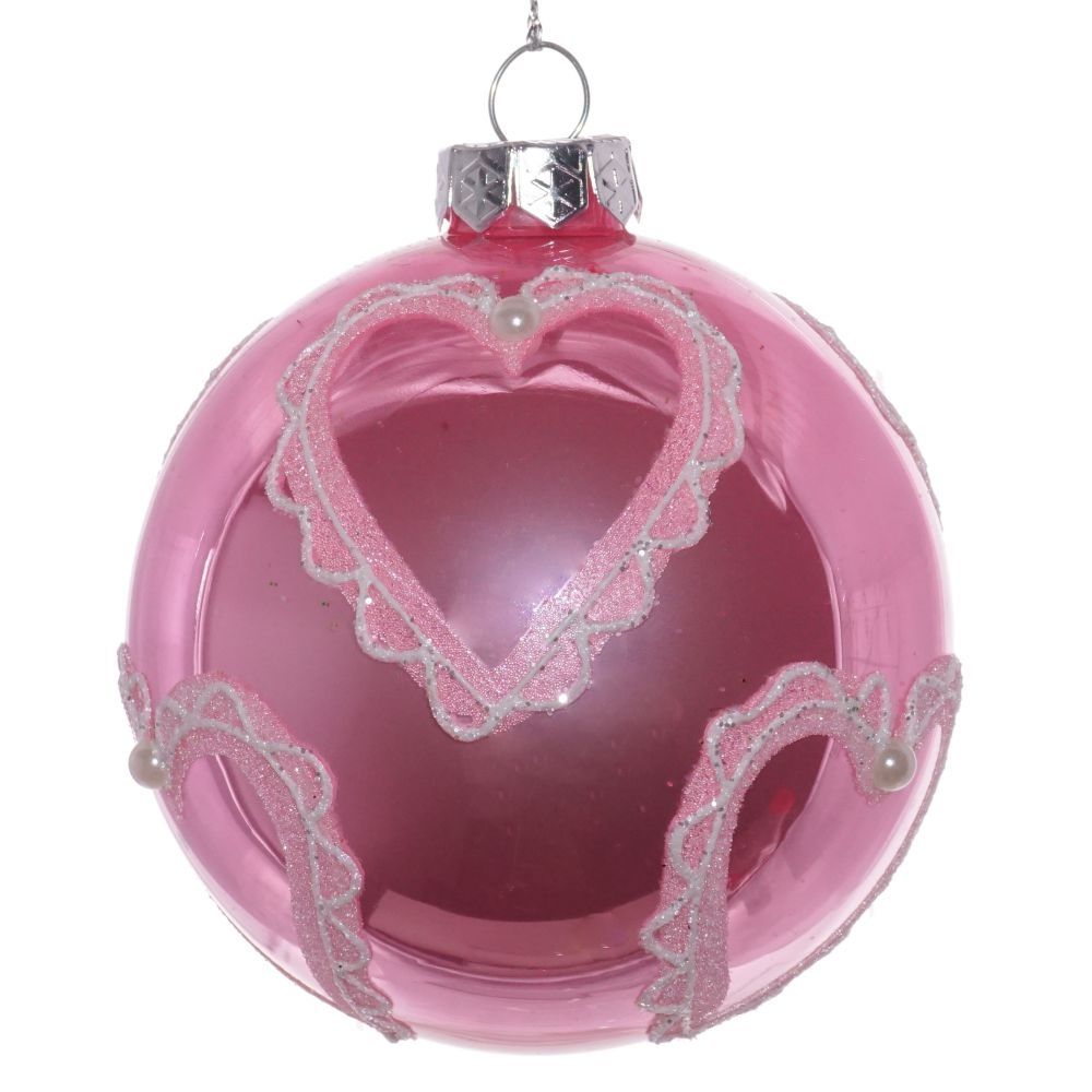 Стеклянный шар выполнен в традиционном праздничном стиле. Глянцевая поверхность и изящные узоры в виде сердечек придают этому шару особую изысканность.