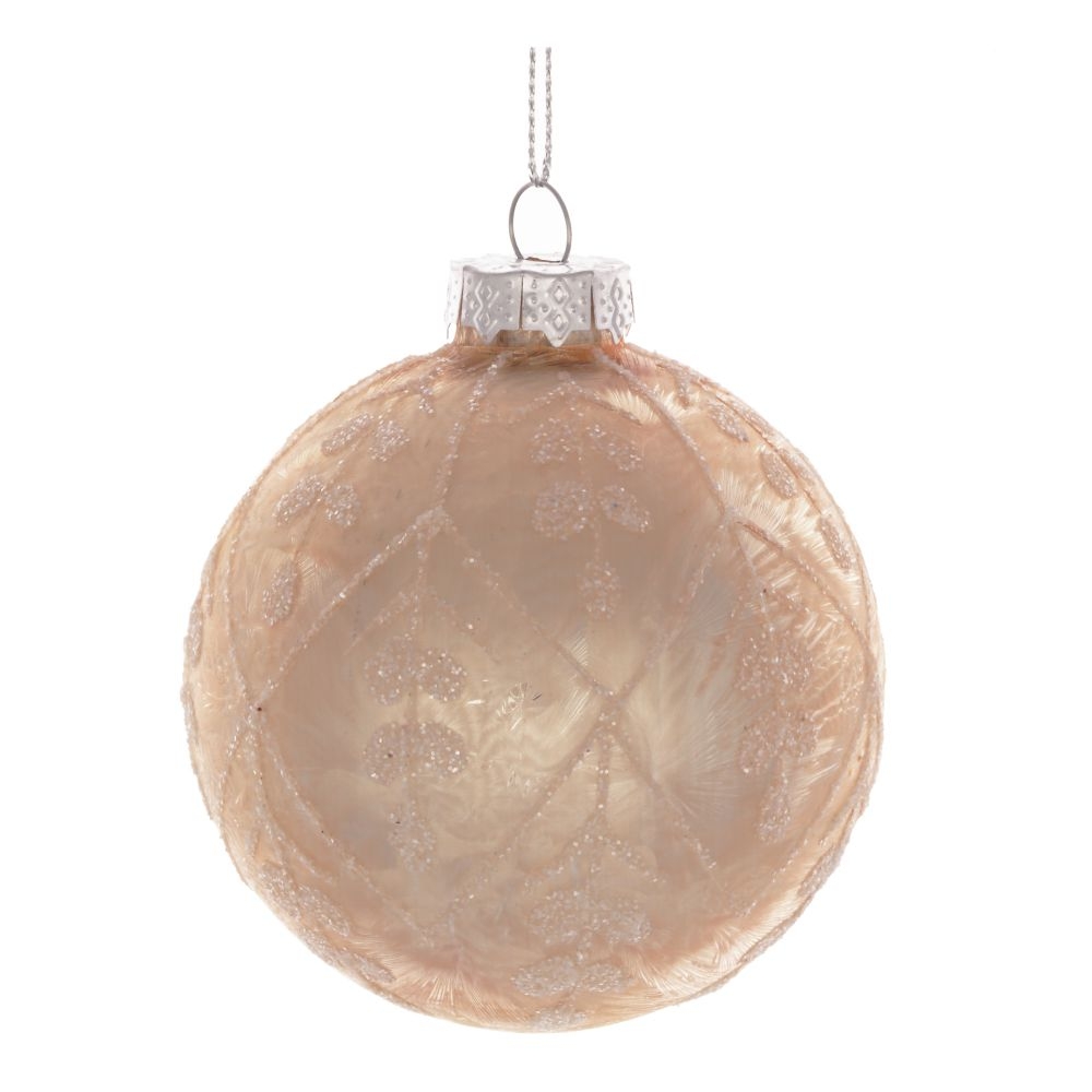 Стеклянный шар выполнен в традиционном праздничном стиле. Глянцевая поверхность и изящные узоры придают этому шару особую изысканность.