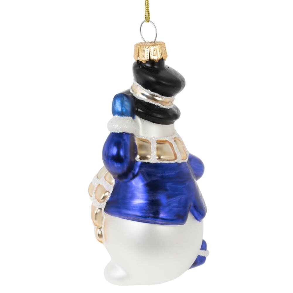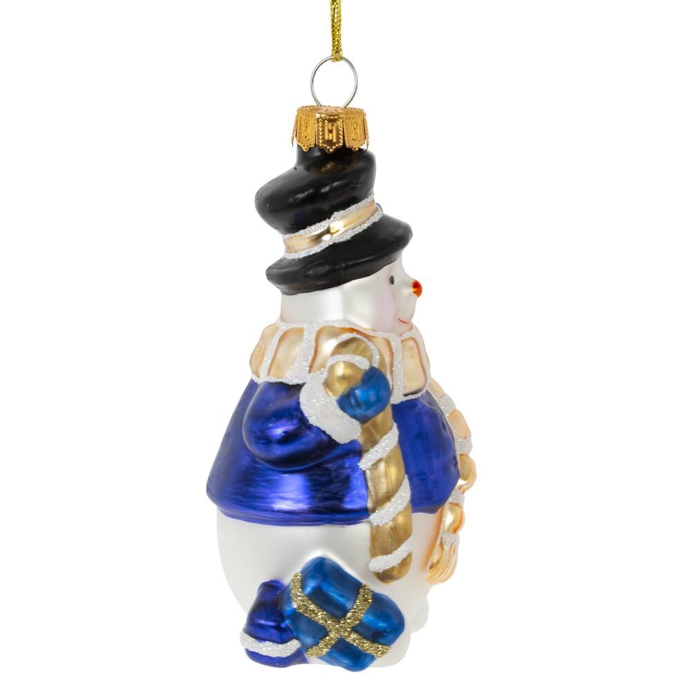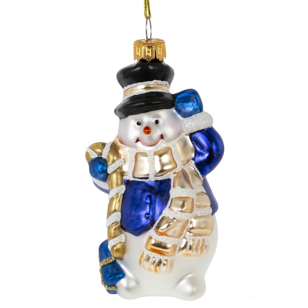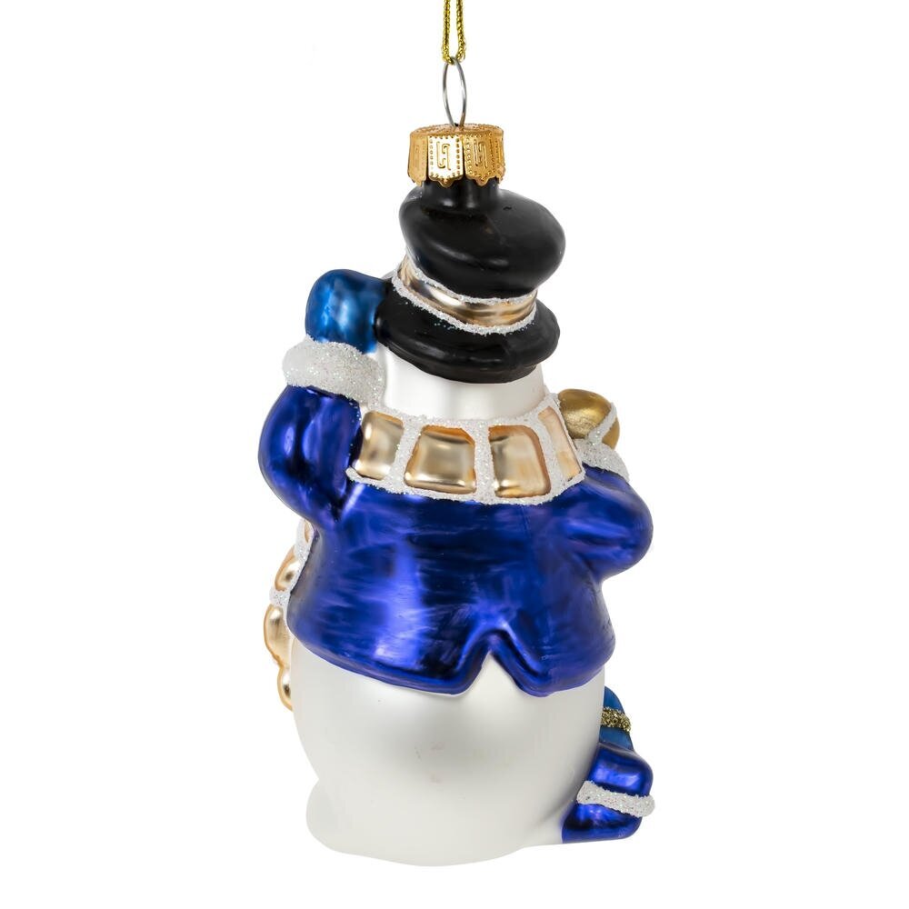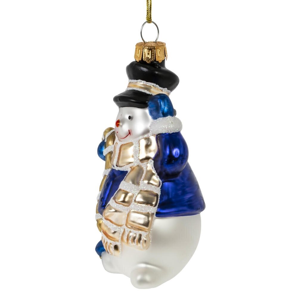 Ёлочное украшение из стекла в виде снеговика выполнено с большим вниманием к деталям и оформлено в праздничной цветовой гамме. Снеговик одет в яркую синюю шубку, украшенную мерцающими акцентами, и дополнен золотистым шарфиком, придающим образу тепло и нарядность. Блестящая поверхность стекла красиво отражает свет гирлянд, создавая эффект мягкого сияния. Очаровательная улыбка снеговика и его уютный образ наполняют пространство атмосферой доброты и зимнего волшебства. Это украшение станет ярким акцентом на новогодней ёлке и подарит радость как детям, так и взрослым.
