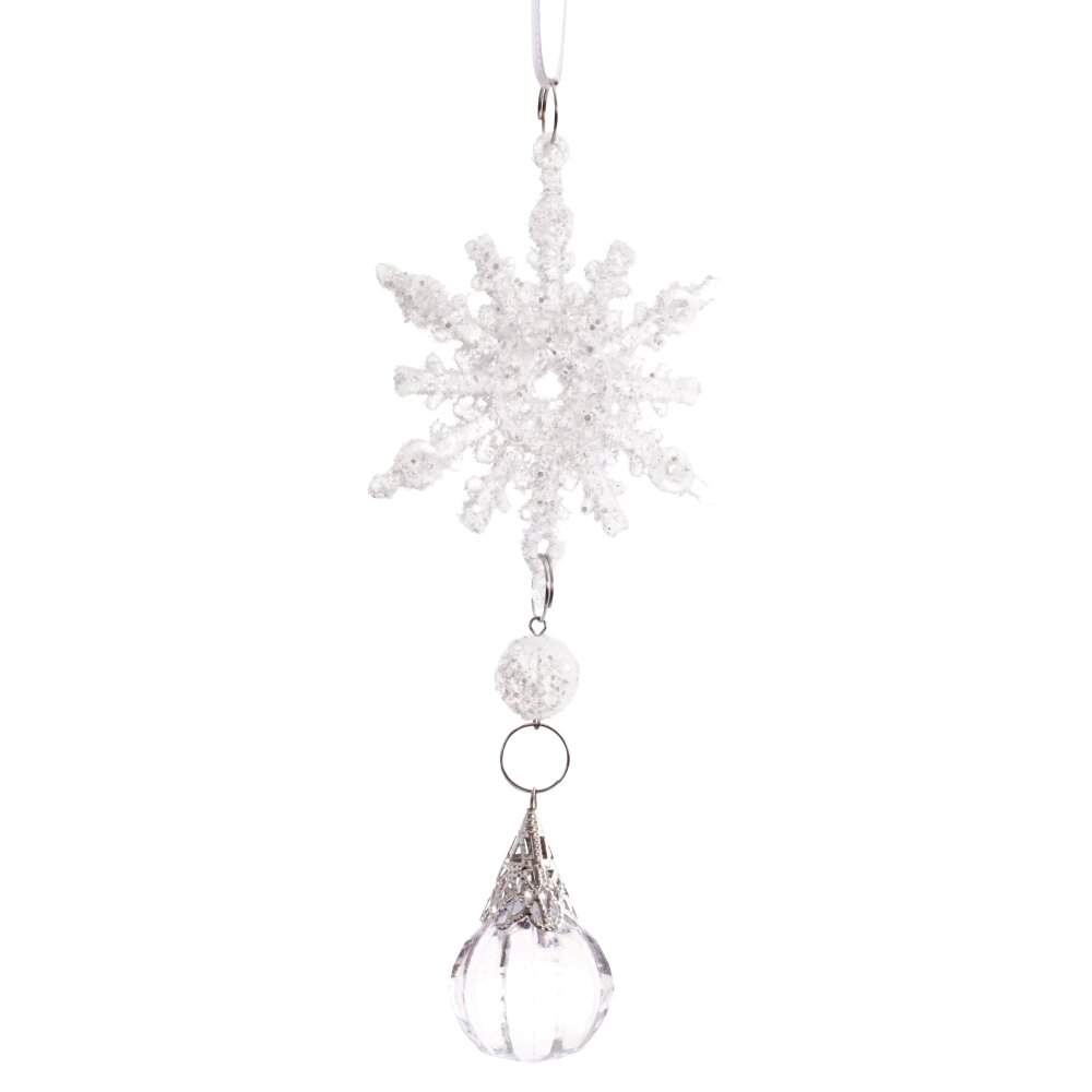 Новогоднее украшение "Снежинка" привлечет внимание своим изысканным дизайном. Ажурная снежинка из прозрачного материала с блеском снежного глиттера и нежной подвеской в виде хрустальной капли создает праздничное настроение. Подвесьте это изделие на елку или окно и наслаждайтесь игрой света и тени!