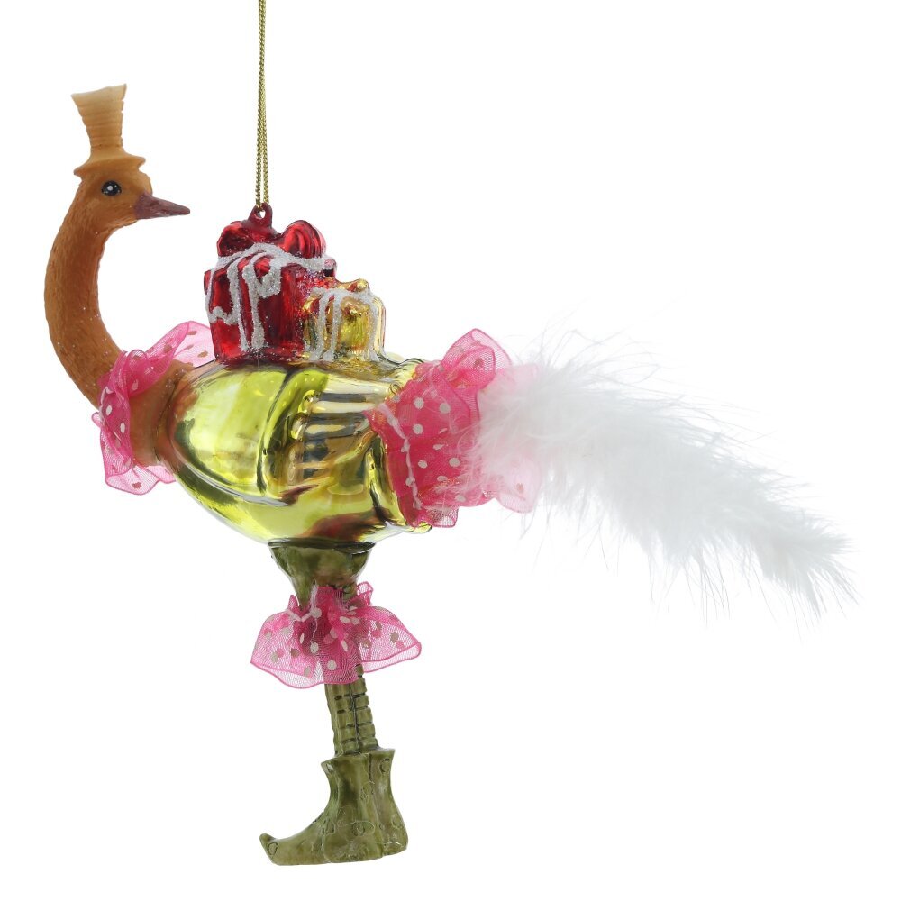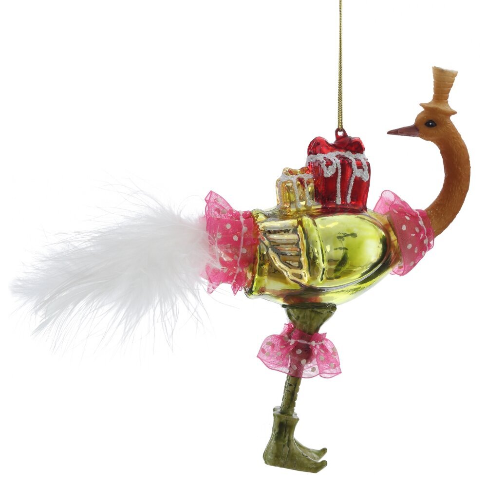 Это стеклянное украшение в виде страуса выполнено в ярких, насыщенных цветах, которые сразу привлекают внимание и добавляют праздничного настроения в любой интерьер. Фигура изящно расписана, что придаёт ей уникальность и живость, а использование контрастных оттенков подчёркивает детали и формы птицы. Особый шарм изделию придаёт настоящее перо, аккуратно закреплённое на хвостовой части, которое создаёт эффект живой текстуры и воздушности. Стекло блестит и переливается на свету, отражая лучи гирлянд и создавая атмосферу волшебства. Такое украшение станет необычным и выразительным акцентом на новогодней ёлке или праздничной композиции, привнося элемент экзотики и изящества. Благодаря своему качественному исполнению и оригинальному дизайну, этот страус может стать не только красивым декоративным элементом, но и памятным подарком, который будет радовать глаз и душу многие годы.