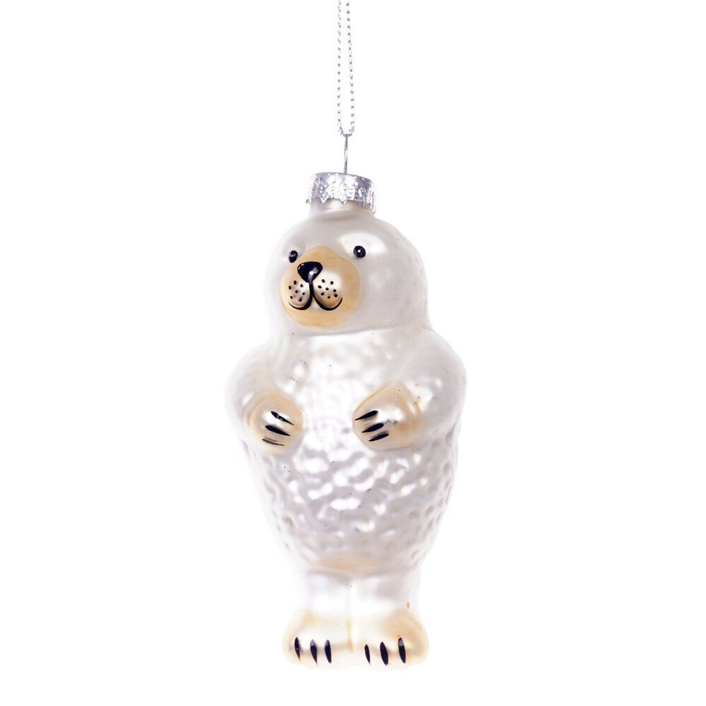 Елочное украшение в виде тюленя из стекла выполнено в изящной бело-серебристой гамме. Блестящая поверхность и утончённые детали придают изделию нежность и праздничный шарм. Такое украшение станет элегантным акцентом на вашей новогодней ёлке и добавит зимней сказочности в атмосферу праздника.