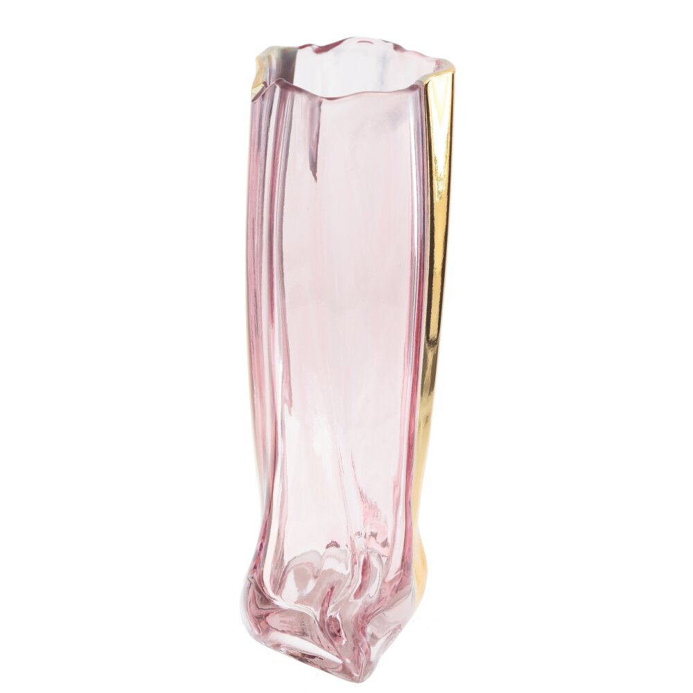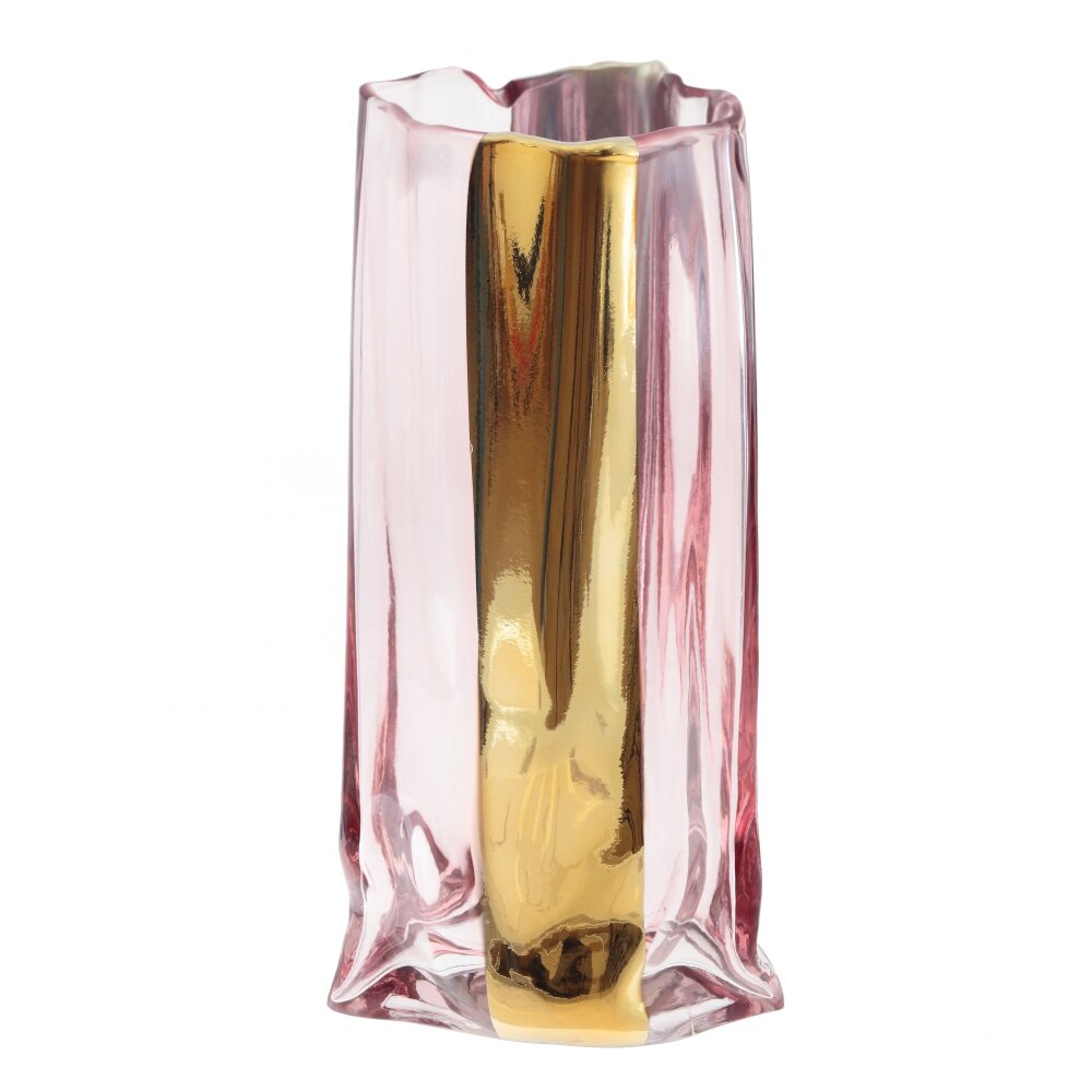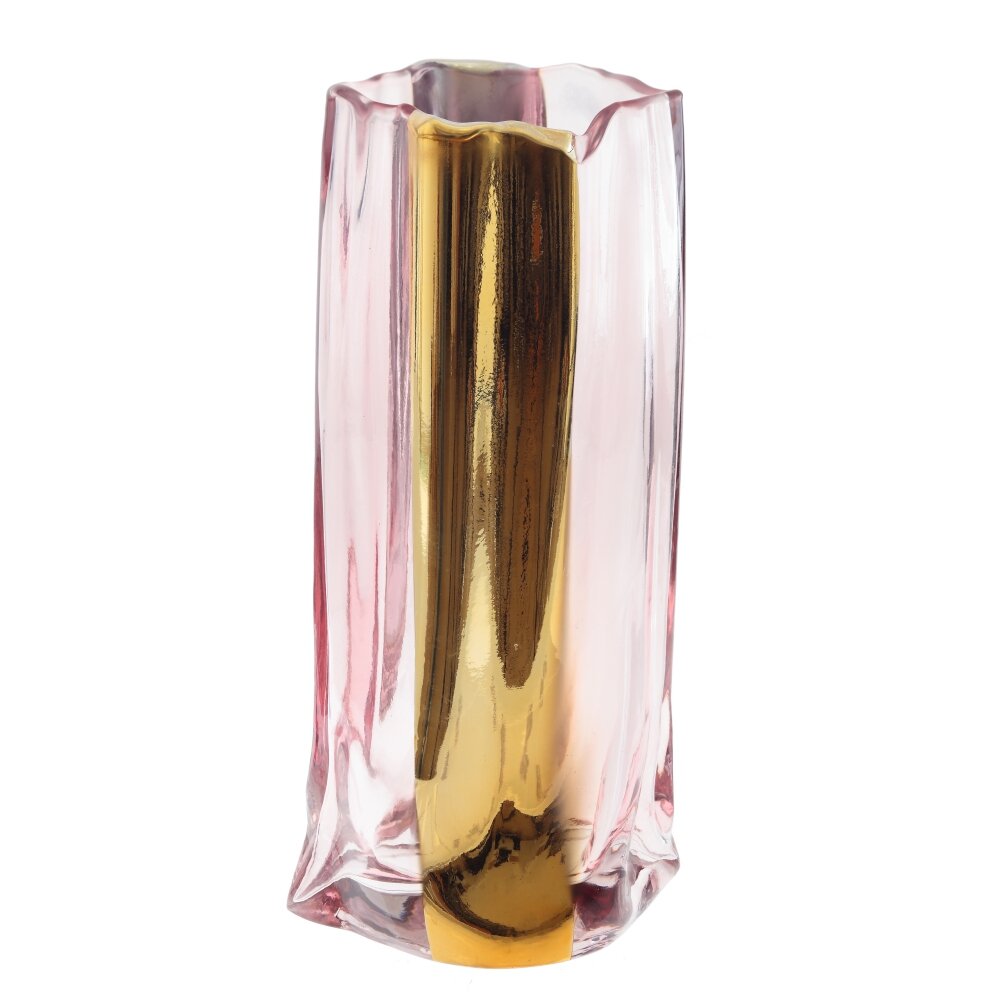 Эта изысканная ваза объемом 1900 мл изготовлена из стекла. Она отличается уникальным дизайном: прозрачные стенки с легким розовым оттенком придают изделию нотку нежности и легкости, а вертикальная золотистая вставка добавляет выразительности и элегантности. Прямоугольная форма и волнистые края создают современный облик, который привлечет внимание в любом интерьере. Такая ваза станет стильным акцентом гостиной, спальни или кабинета, превосходно подойдет как для живых, так и для искусственных цветов. Прозрачная структура стекла позволяет наблюдать за движением воды и стеблями растений, что добавляет декоративности и динамичности в любую композицию. Ваза сочетает в себе функциональность и декоративность, делая её отличным выбором для подарка или собственного дома. Размер горловины: 11*9 см.