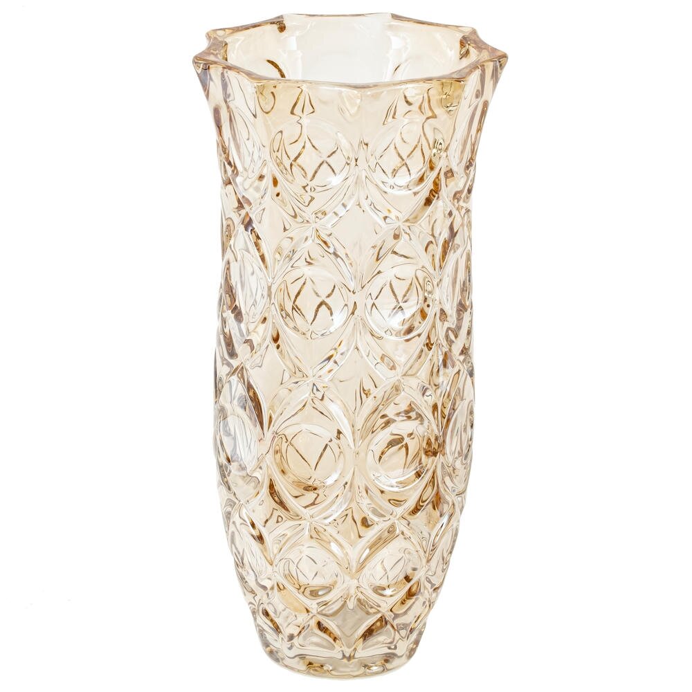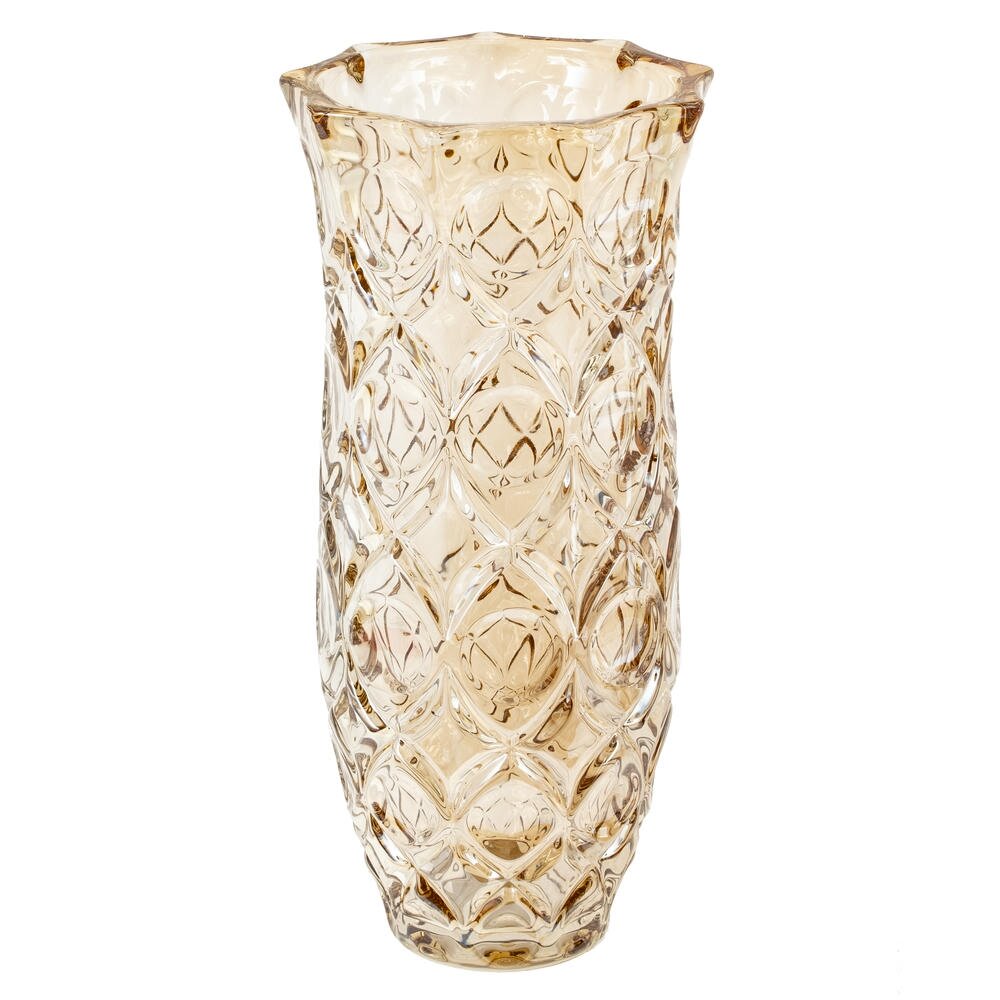 Элегантная стеклянная ваза объёмом 2000 мл станет стильным акцентом в любом интерьере. Выполнена из прочного прозрачного стекла с тёплым янтарным оттенком и выразительным рельефным узором в виде переплетающихся овальных граней. Высокая цилиндрическая форма подходит для букетов из длинностебельных цветов, декоративных веток или сухоцветов. Благодаря фактурной поверхности ваза красиво преломляет свет и создаёт интересные блики на столе или подоконнике. Идеальна для гостиной, спальни или офиса, гармонично сочетается как с классическим, так и с современным стилем оформления пространства. Диаметр горловины: 11.5 см.