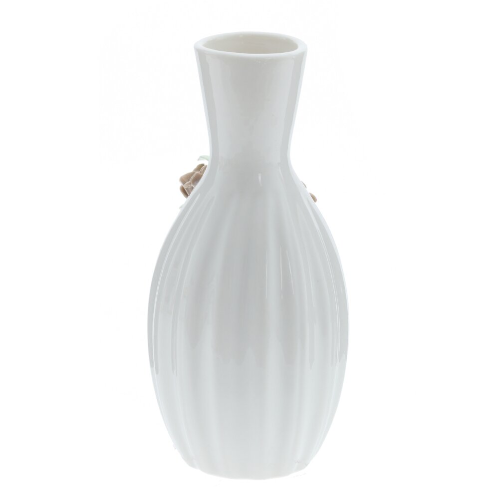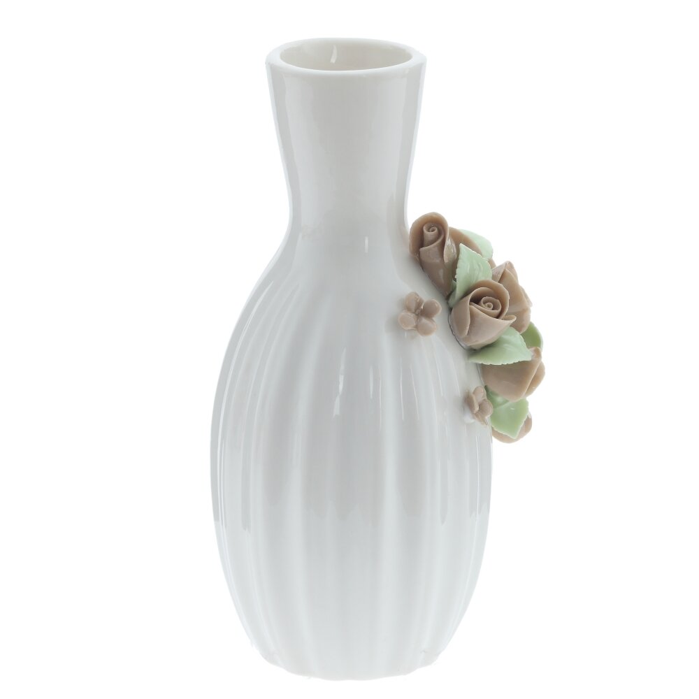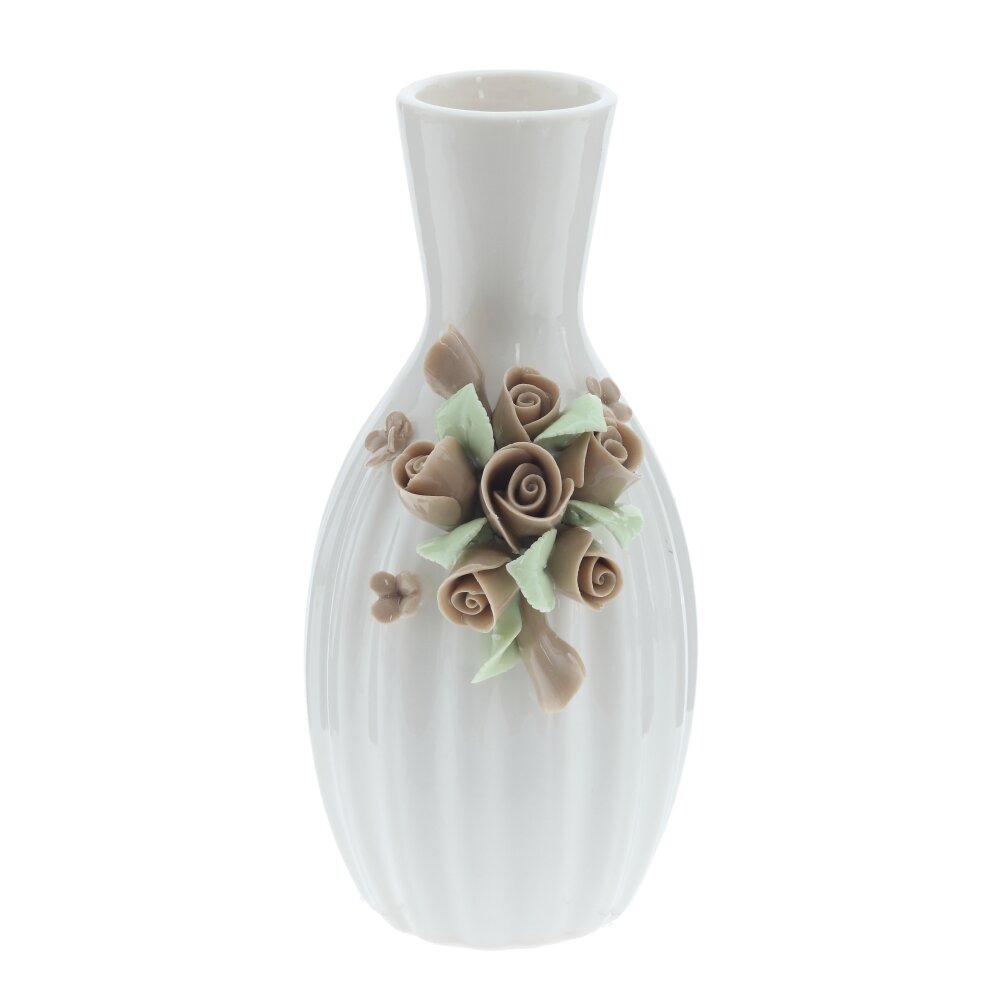 Фарфоровая ваза — изысканный элемент декора, который отлично подойдет для украшения вашего дома или в качестве подарка. Ваза выполнена из высококачественного фарфора, имеет глянцевую поверхность и отличается изящной формой. Особое внимание привлекают объемные декоративные цветы, искусно выполненные вручную и расположенные на лицевой стороне изделия. Нейтральная цветовая гамма, белый корпус с бежевыми розами и светло-зелёными листьями, делает вазу универсальной для любого интерьера — она будет гармонично смотреться как в классическом, так и в современном стиле. Такая ваза превосходно подойдет для живых или искусственных цветов, а также станет самостоятельным декоративным акцентом в гостиной, спальне или на кухне. Диаметр горловины: 2 см.
