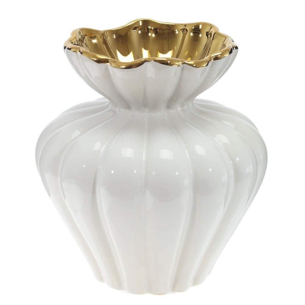 Эта ваза станет ярким акцентом в вашем интерьере, придавая ему утончённость и элегантность. Изготовлена из фарфора. Ваза идеальна как самостоятельный элемента декора, так и в сочетании с цветами. Она великолепно подчеркнёт как свежие букеты, так и сухие композиции, создавая уникальную атмосферу в вашем доме. Белый цвет символизирует чистоту и гармонию, а золотые акценты придают вазе особое изящество, что делает её идеальной для любого интерьера — от классического до современного. Эта ваза станет не только стильным дополнением вашего пространства, но и прекрасным подарком для друзей и близких. Создайте уют и красоту с помощью этой изысканной вазы, которая несомненно привлечет взгляды и станет настоящим произведением искусства в вашем доме. Диаметр горловины: 5 см.