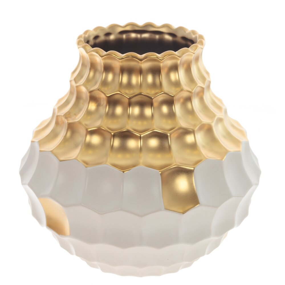Фарфоровая ваза станет доминантой вашего интерьера. Вместительная и устойчивая, она с легкостью примет в свои объятия пышные букеты из роз, пионов, лилий или других цветов, подчеркнув их красоту. Благородный белый цвет вазы в сочетании с изысканным золотым создает атмосферу роскоши и утонченности. Рельефные элементы переливаются на свету, добавляя вазе очарования. Ваза станет бесценным украшением вашего дома, привнося в него нотку величия и аристократизма. Она прекрасно впишется в классический или современный интерьер. Так же ваза может стать оригинальным подарком для ваших близких и друзей. Диаметр горлышка: 8,5 см.