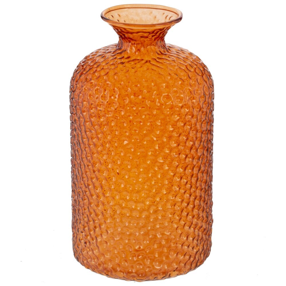 Компактная ваза из стекла объемом 440 мл с выразительной пузырчатой фактурой поверхности. Цвет оранжевый, полупрозрачный: он мягко рассеивает свет и подчеркивает рельеф. Форма цилиндрическая с плавными «плечиками», коротким узким горлышком и слегка расклешенным краем; широкое дно обеспечивает устойчивость на полке или тумбе. Подходит для одной-двух веток, мини-букета, сухоцветов или тростниковых палочек-диффузоров. Стильный акцент для интерьеров в духе сканди, минимализма и лофта, уместна как самостоятельный декор. Уход простой: ручная мойка теплой водой без абразивов, не рекомендуется резкий перепад температур. Отличная идея для подарка и ежедневного использования.