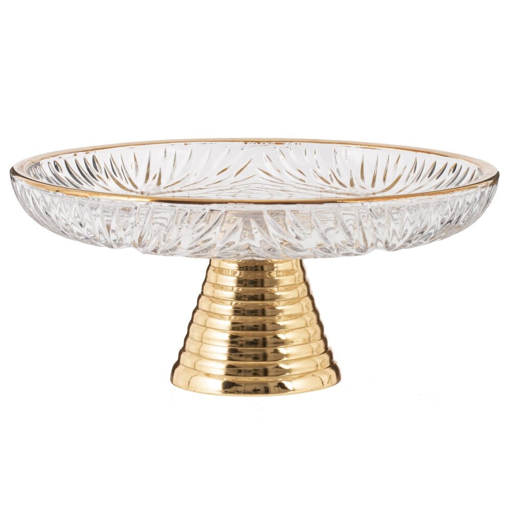 Элегантная ваза для фруктов, выполненная из стекла и металла. Верхняя часть вазы изготовлена из прозрачного стекла с оригинальным рельефным рисунком, который создает эффект россыпи лучей или листьев, отражая свет и придавая изделию изысканный вид. Основание вазы выполнено из металла с золотистым покрытием, что добавляет изделию статусности и гармонично сочетается с хрустальной латунной прозрачностью верха. Такая фруктовница станет отличным акцентом в интерьере кухни или гостиной, подчеркнет вкус хозяев и украсит любое праздничное застолье. Ваза идеально подходит для сервировки стола и хранения различных фруктов или сладостей, благодаря устойчивому основанию и вместительной чаше.