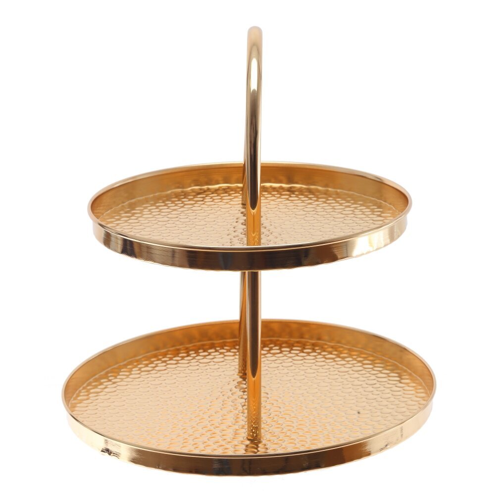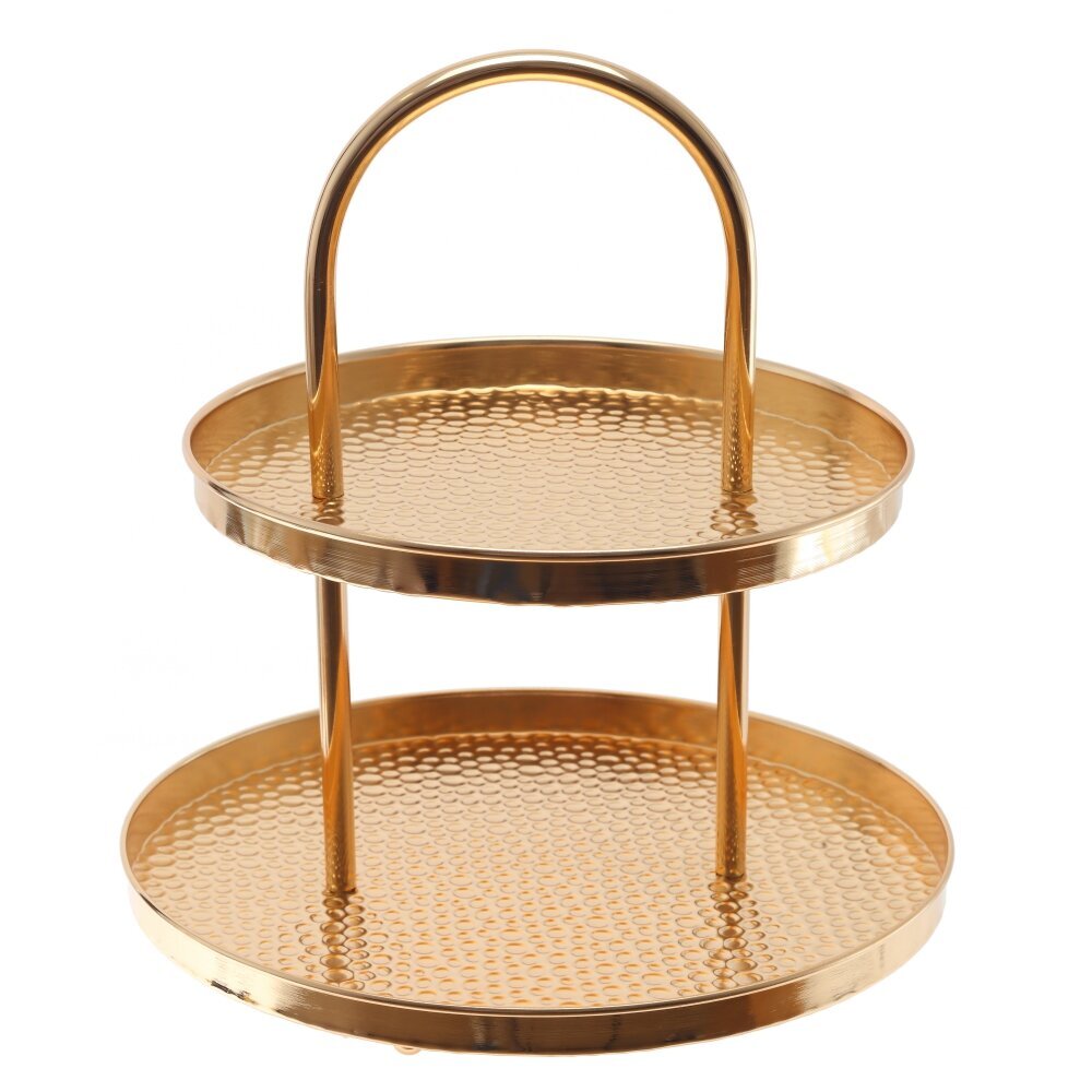 Эта элегантная двухъярусная ваза для фруктов изготовлена из прочного металла с изысканным золотистым покрытием. Ее стильный дизайн и уникальная текстура поверхности делают ее не только практичной, но и эстетически привлекательной деталью интерьера. Верхний и нижний ярусы позволяют удобно хранить фрукты, выпечку или конфеты, экономя место на столе. Изогнутая ручка в верхней части упрощает переноску. Такая ваза станет отличным украшением кухни или гостиной, добавляя нотки роскоши и утонченности в любой интерьер.