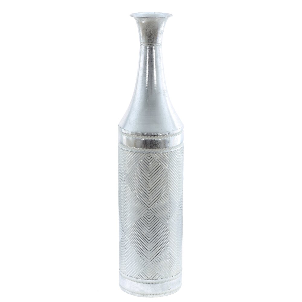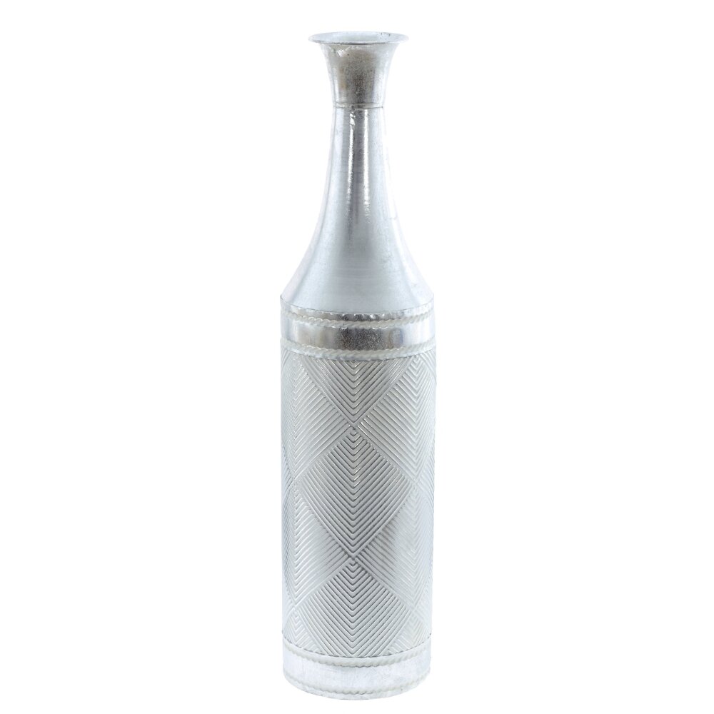 Элегантная напольная ваза для искусственных цветов, выполненная из металла. Форма вытянутая, с плавным сужением к горлышку и слегка раструбленным краем. Верхняя часть гладкая и блестящая, а цилиндрический корпус украшен рельефным геометрическим узором с тонкими линиями и ромбами, создающими игру света на серебристой поверхности. Устойчивая база обеспечивает надежную установку на полу. Ваза хорошо смотрится с сухоцветами, декоративными ветвями и искусственными букетами; подходит для гостиных, холлов и спальни, органично вписывается в интерьеры в стиле модерн, лофт, минимализм и сканди. Уход прост: протирать мягкой сухой салфеткой, не заполнять водой. Диаметр горловины: 5 см.