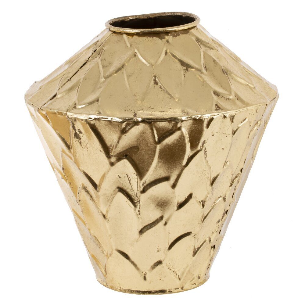 Эта декоративная ваза для искусственных цветов изготовлена из металла и имеет оригинальный современный дизайн. Ее поверхность покрыта золотистым оттенком, что придаёт изделию ощущение роскоши и элегантности. Вазу украшает текстурный рисунок, напоминающий лепестки или чешую, что добавляет ей особую выразительность и делает её ярким акцентом в любом интерьере. Широкое горлышко позволяет легко размещать в ней искусственные цветы или декоративные композиции. Такая ваза отлично подойдет для украшения гостиной, спальни или офиса, подчеркнет изысканный вкус хозяев и привнесет нотку стиля и уюта в пространство. Металлическая конструкция обеспечивает долговечность и устойчивость, а оригинальная форма вазы будет уместна как в современном, так и в классическом оформлении интерьера. Диаметр горловины: 9 см.