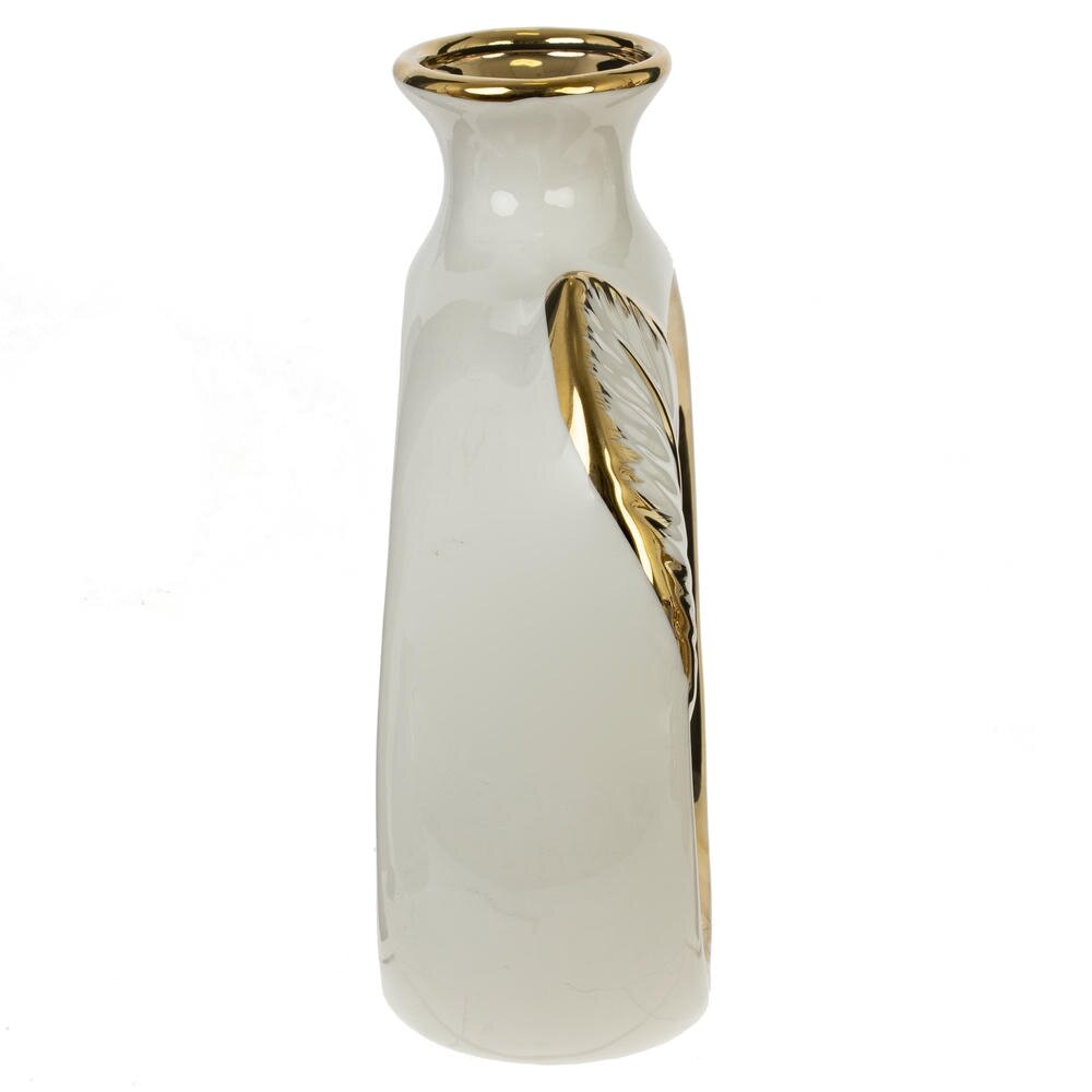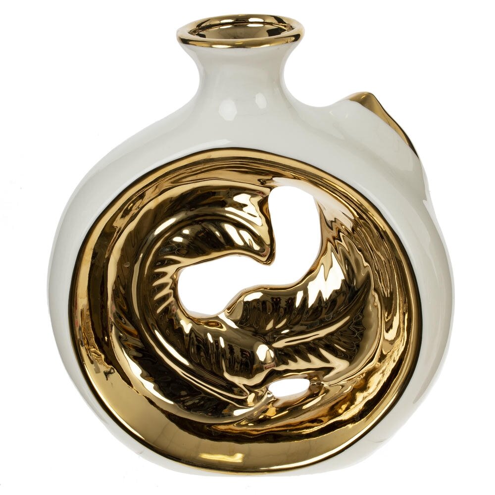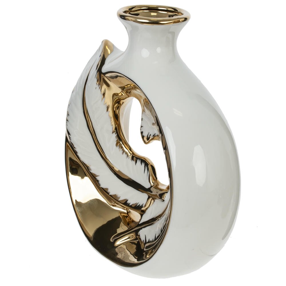 Изящная декоративная ваза для искусственных цветов объёмом 550 мл выполнена из фарфора с глянцевой глазурью. Плоский округлый корпус украшен выразительным рельефным орнаментом в виде переливающихся золотистых перьев с белыми вставками, создающих эффект объёма и легкости. Необычное фигурное отверстие в центре придаёт аксессуару современный, почти скульптурный характер. Ваза станет стильным акцентом в гостиной, спальне или офисе, гармонично дополняя интерьер в классическом, современном или гламурном стиле. Идеальна для композиций из искусственных и сухоцветов, а также в качестве самостоятельного декоративного объекта или подарка. Диаметр горловины: 3 см.