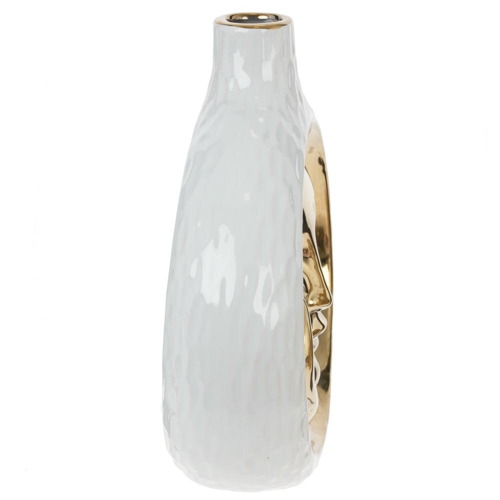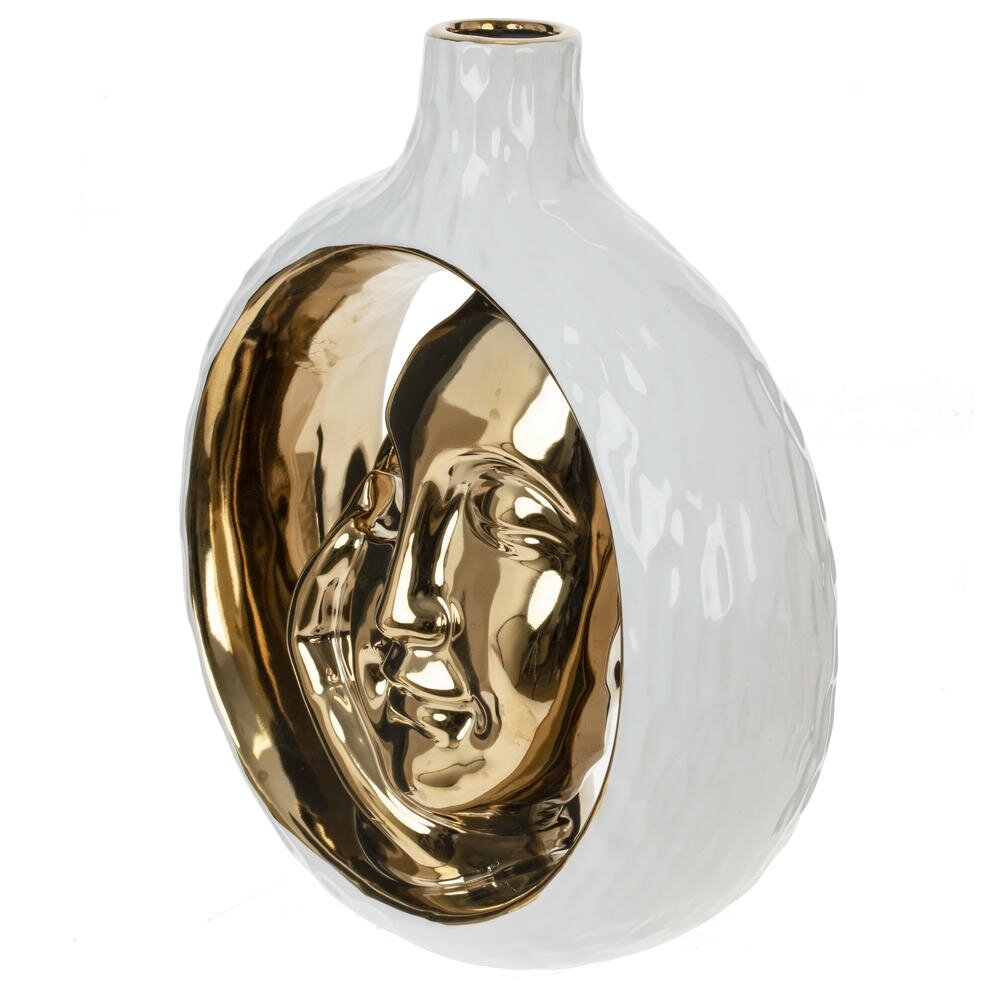 Элегантная декоративная ваза для искусственных цветов объёмом 650 мл – эффектный акцент для современного интерьера. Выполнена из качественного фарфора с глянцевой белой поверхностью и оригинальным вырезом в центре. Внутренняя часть оформлена в виде абстрактного золотистого силуэта лица, что придаёт изделию скульптурный, арт?образ. Ваза отлично сочетается с минималистичными и дизайнерскими композициями, подходит для гостиной, спальни, офиса или зоны приёма гостей. Станет стильным подарком ценителям необычного декора и легко впишется как в светлую, так и в контрастную цветовую гамму помещения. Диаметр горловины: 2.5 см.