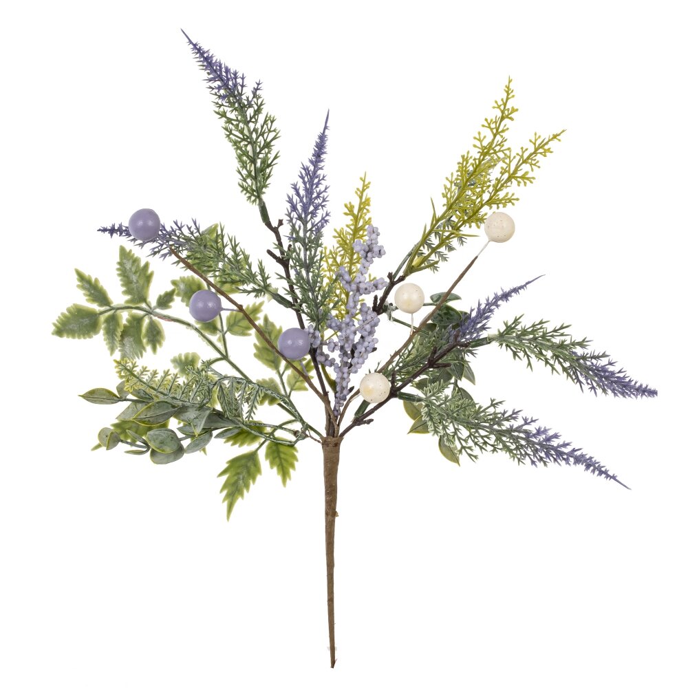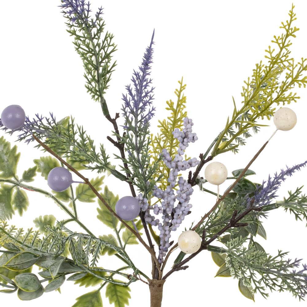 Искусственная пасхальная ветка – нежное и долговечное украшение для весеннего декора дома. Сочетание фактурной зеленой листвы, тонких веточек лаванды и декоративных шариков в пастельных сиреневых и кремовых тонах создаёт ощущение свежести и праздничного настроения. Композиция напоминает весенний букет с маленькими пасхальными яйцами и подходит для оформления стола, корзин, венков, подарочных композиций и интерьерных ваз. Ветка выполнена из качественных полимерных материалов и металла, не требует ухода, сохраняет форму и цвет из года в год. Лёгкая и пластичная основа позволяет сгибать стебли и придавать изделию нужный объём, идеально вписывая в любой пасхальный декор.