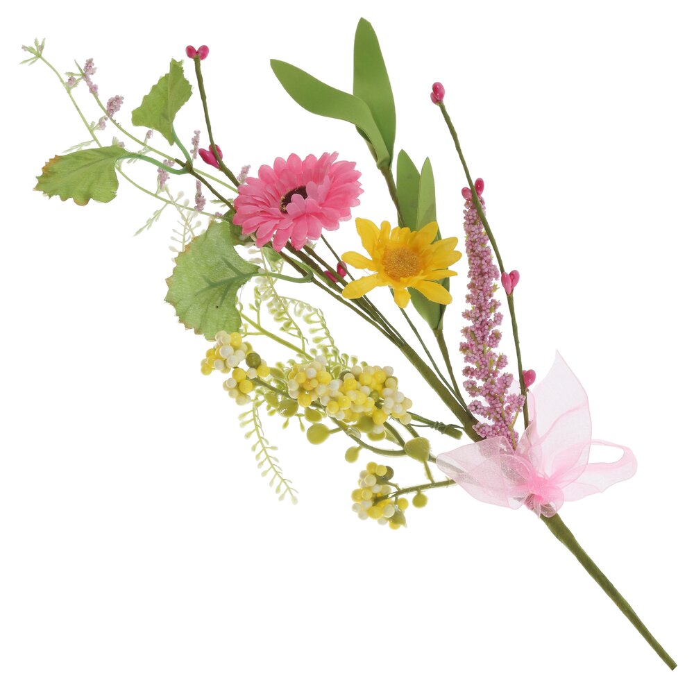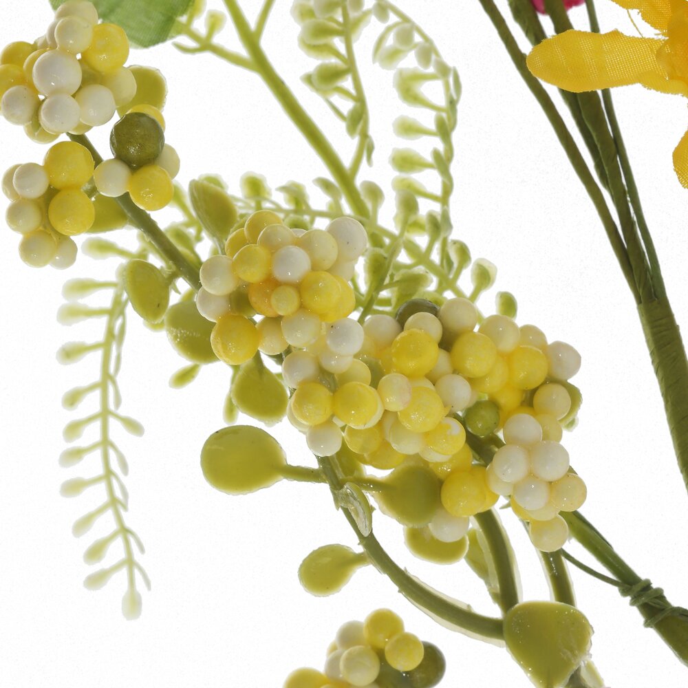 Яркая пасхальная искусственная ветка – нежный весенний акцент для вашего дома. Составленная из текстильных и пластиковых цветов в розово-жёлтой гамме, с сочной зеленью и ягодками-бусинами, она выглядит свежей и живой круглый год. Воздушный розовый бант придаёт композиции праздничность и легкость. Ветка идеально подойдёт для оформления пасхального стола, украшения корзинки с куличами и яйцами, создания венков или сезонных композиций в вазе. Не требует ухода, не осыпается и сохраняет форму, поэтому станет многоразовым декором для Пасхи и весенних праздников.