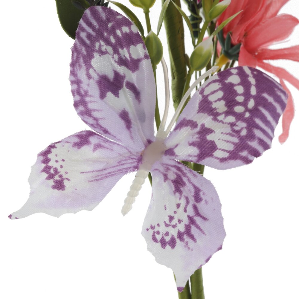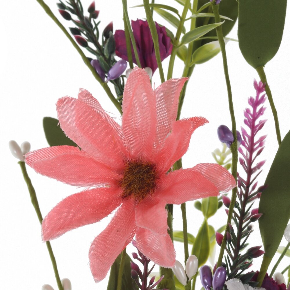 Яркая декоративная ветка к Пасхе – изящное украшение вашего дома, которое не завянет и будет радовать много лет. На гибком зелёном стебле собран пышный букет из мелких полевых цветков, нежных розово?коралловых бутонов и белых соцветий с жёлтыми серединками. Дополняют композицию насыщенно?фиолетовые акценты, свежие зелёные листочки и фигурка бабочки в тон. Ветка хорошо держит форму, её можно сгибать и вплетать в венки, пасхальные композиции, корзины или использовать как самостоятельный декор стола и подоконника. Отличный вариант для создания весеннего, светлого настроения на Пасху.