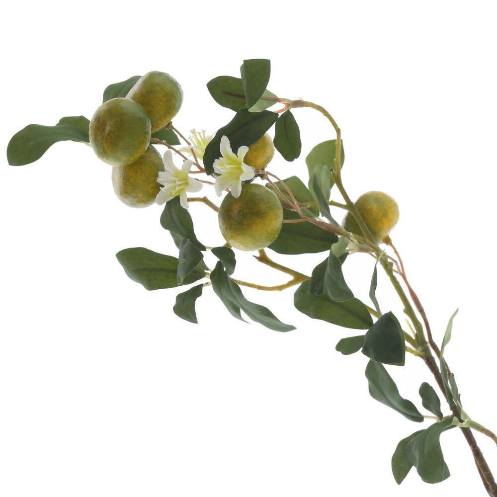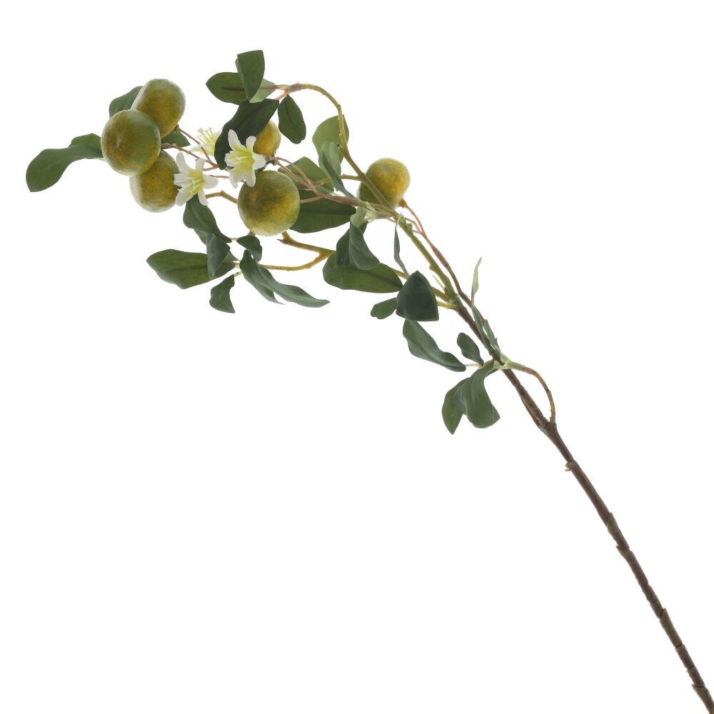 Искусственная ветка мандарина — изящный декоративный акцент для интерьера. На тонком коричневом стебле расположены плотные зеленовато?желтые плоды разного размера, окруженные насыщенно?зелеными листьями и мелкими светлыми цветками. Реалистичная фактура и естественные оттенки создают впечатление живого растения, при этом композиция не требует ухода: не вянет, не осыпается и сохраняет форму круглый год. Ветку удобно использовать в вазах, сезонных композициях, витринах, фотозонах или для оформления подарков. Гибкий стебель позволяет легко менять изгиб и направление. Идеальный вариант для кухни, гостиной или офисного пространства, чтобы добавить свежести и летнего настроения.