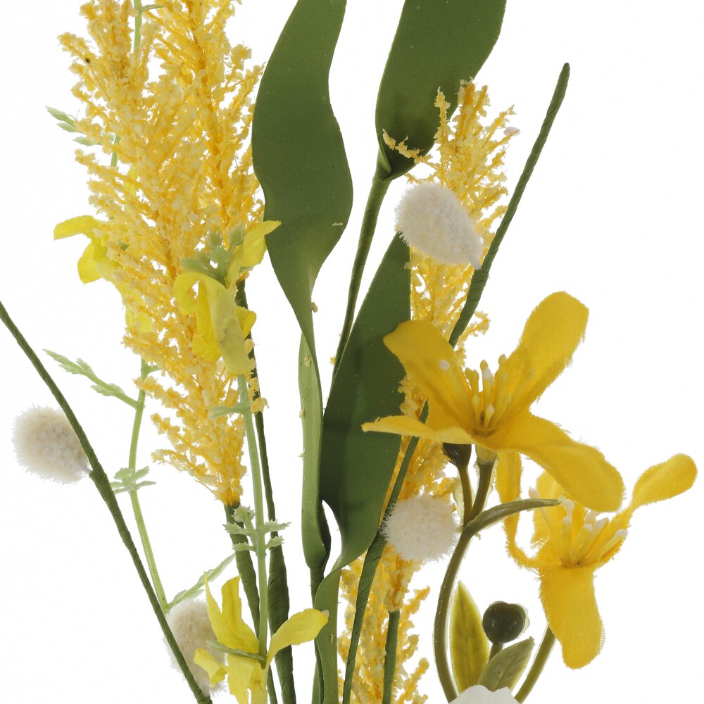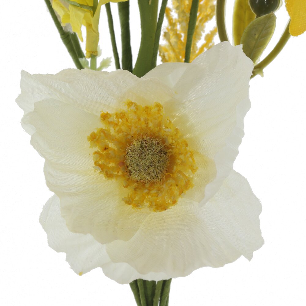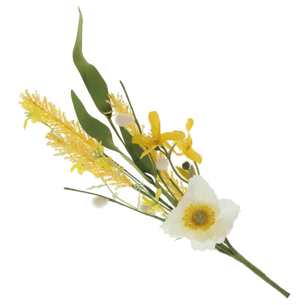Искусственная ветка «Пасхальная» – нежное весеннее украшение для дома и праздничного стола. Сочетание тонких зеленых листьев, пушистых желтых соцветий и белого цветка с солнечной серединкой создаёт ощущение живого букета и отлично передаёт атмосферу Пасхи. Ветка выполнена из качественных текстильных и полимерных материалов с использованием металлического каркаса, благодаря чему хорошо держит форму, не осыпается и не теряет яркость красок. Подходит для оформления пасхальных композиций, корзин, венков, ваз, а также для декора витрин и фотозон. Не требует ухода, долго сохраняет опрятный вид и поможет быстро создать праздничное настроение в любом интерьере.