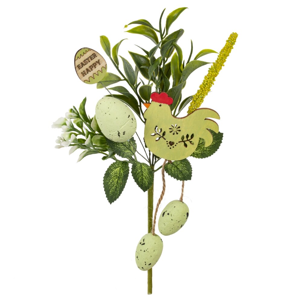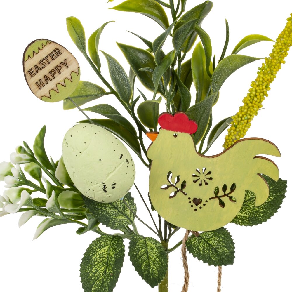 Искусственная ветка «Пасхальная» — яркое и уютное украшение для весеннего интерьера и праздничного стола. Композиция сочетает густую зелень, белые бутончики и декоративные элементы в виде пасхальных яиц и забавной курочки из дерева. Нежно-зелёные яйца с тёмными крапинками и подвесками на шнуре создают эффект натуральности, а с вырезанным узором и надписью на декоративном яйце «EASTER HAPPY» добавляет особое настроение праздника. Ветку удобно использовать для оформления корзин, композиций в вазах, декора камина, витрин, подарочных наборов или фотозоны к Пасхе. Лёгкая и прочная, она станет стильным акцентом и поможет быстро создать атмосферу тепла и весеннего обновления в доме или офисе.