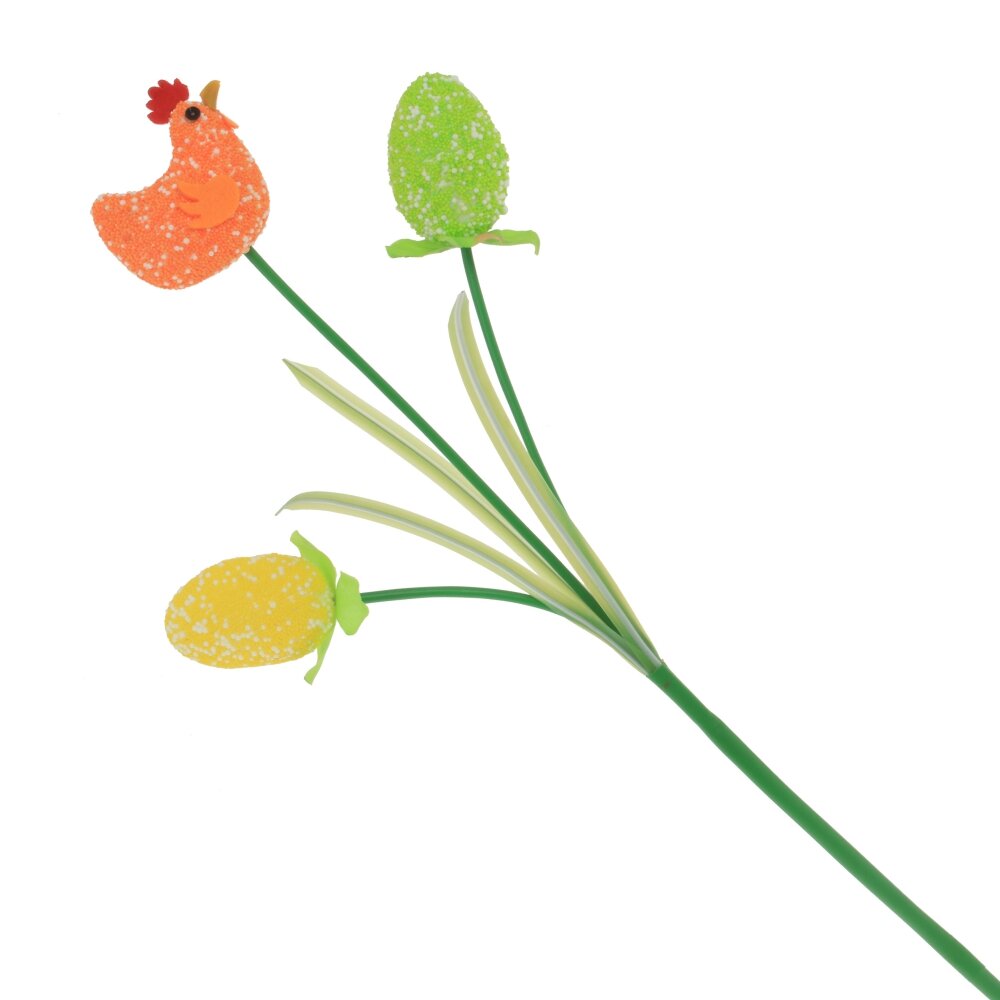 Пасхальная ветка, украшенная декоративными яйцами и фигуркой курочки, прекрасно подойдет для весенней композиции или как самостоятельный декор.