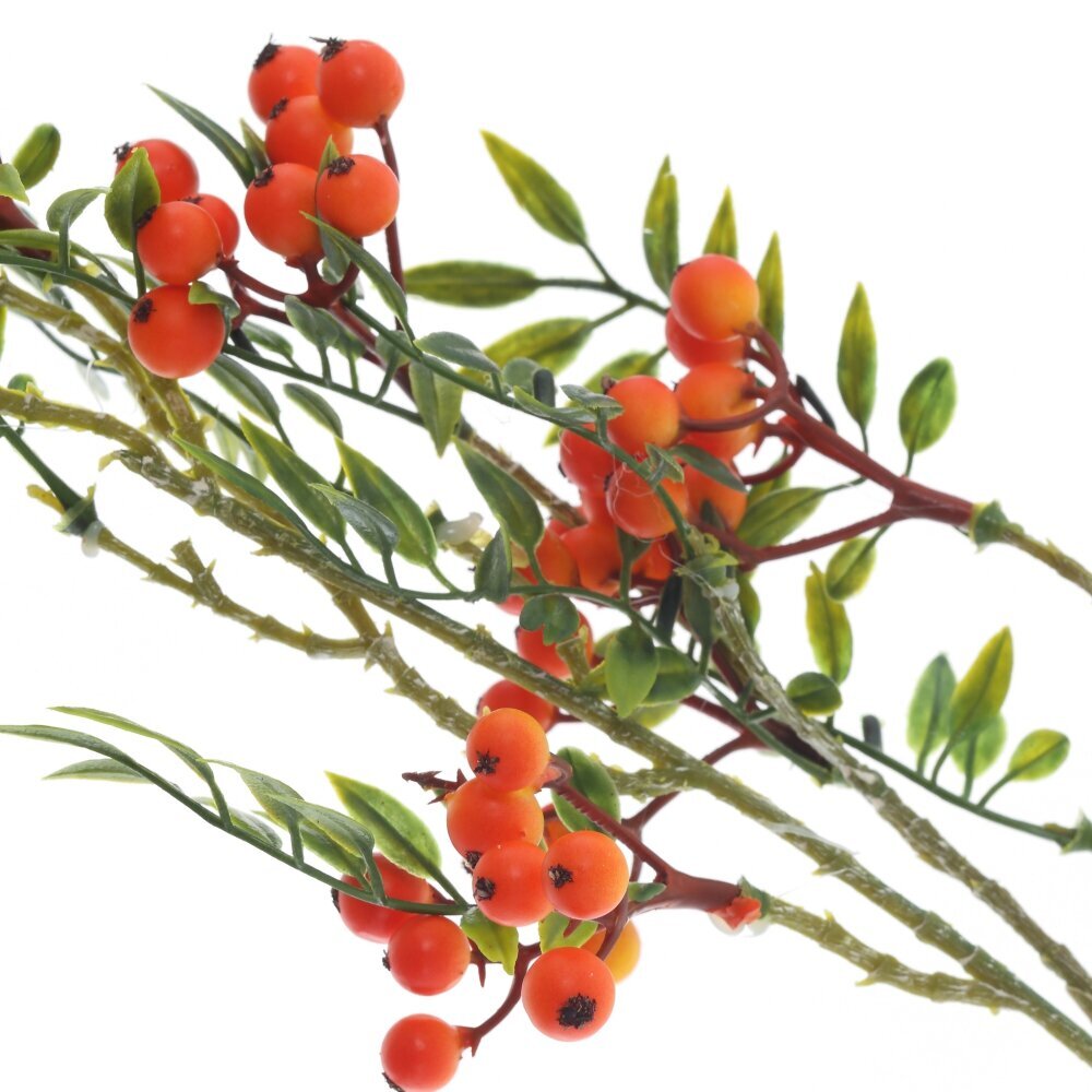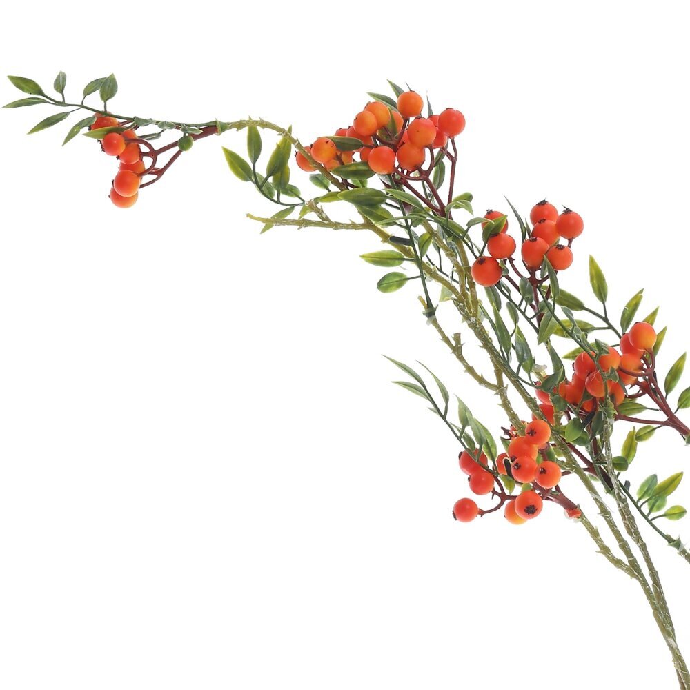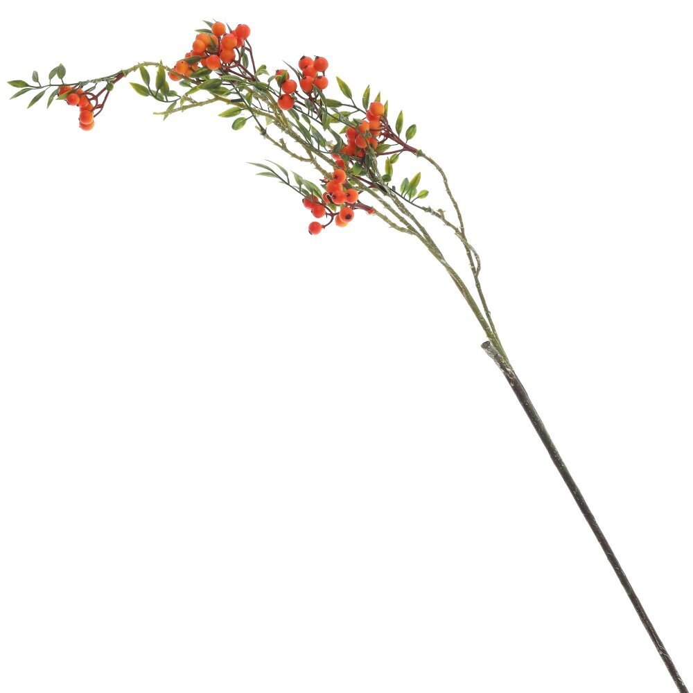 Искусственная ветка рябины — изящный декоративный элемент с реалистичными ало-оранжевыми ягодами, собранными в небольшие кисти. Узкие ланцетные листочки разных оттенков зелёного и тонкие фактурные веточки создают натуральный вид поздней осени. Длинный армированный стебель гибкий: легко выгибается, сохраняет форму и помогает задавать нужное направление в букете или композиции. Ветка не требует ухода, не осыпается, устойчива к выгоранию и перепадам температуры. Идеальна для напольной вазы, сезонных украшений, рождественских и осенних венков, фотозон, витрин и подарочной упаковки — добавляет яркий тёплый акцент и атмосферу уюта.