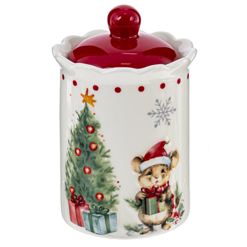 Ёмкость для сыпучих продуктов "Новогодний подарок" вместимостью 350 мл, изготовленная из керамики, украшена рисунком милого мышонка с подарками и елочкой. Крышка красного цвета с ручкой оснащена силиконовым уплотнителем. Подойдет для хранения чая, кофе или сахара, а также может стать хорошим подарком для близких в новогодние праздники.