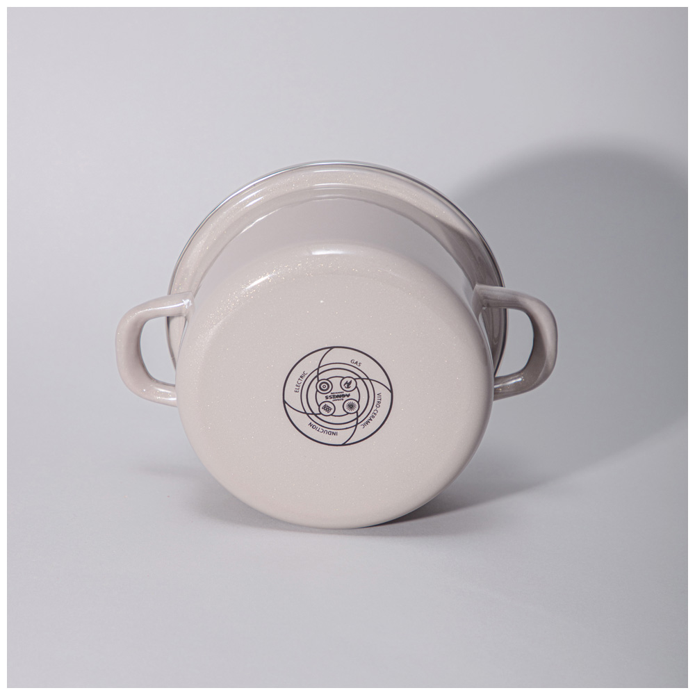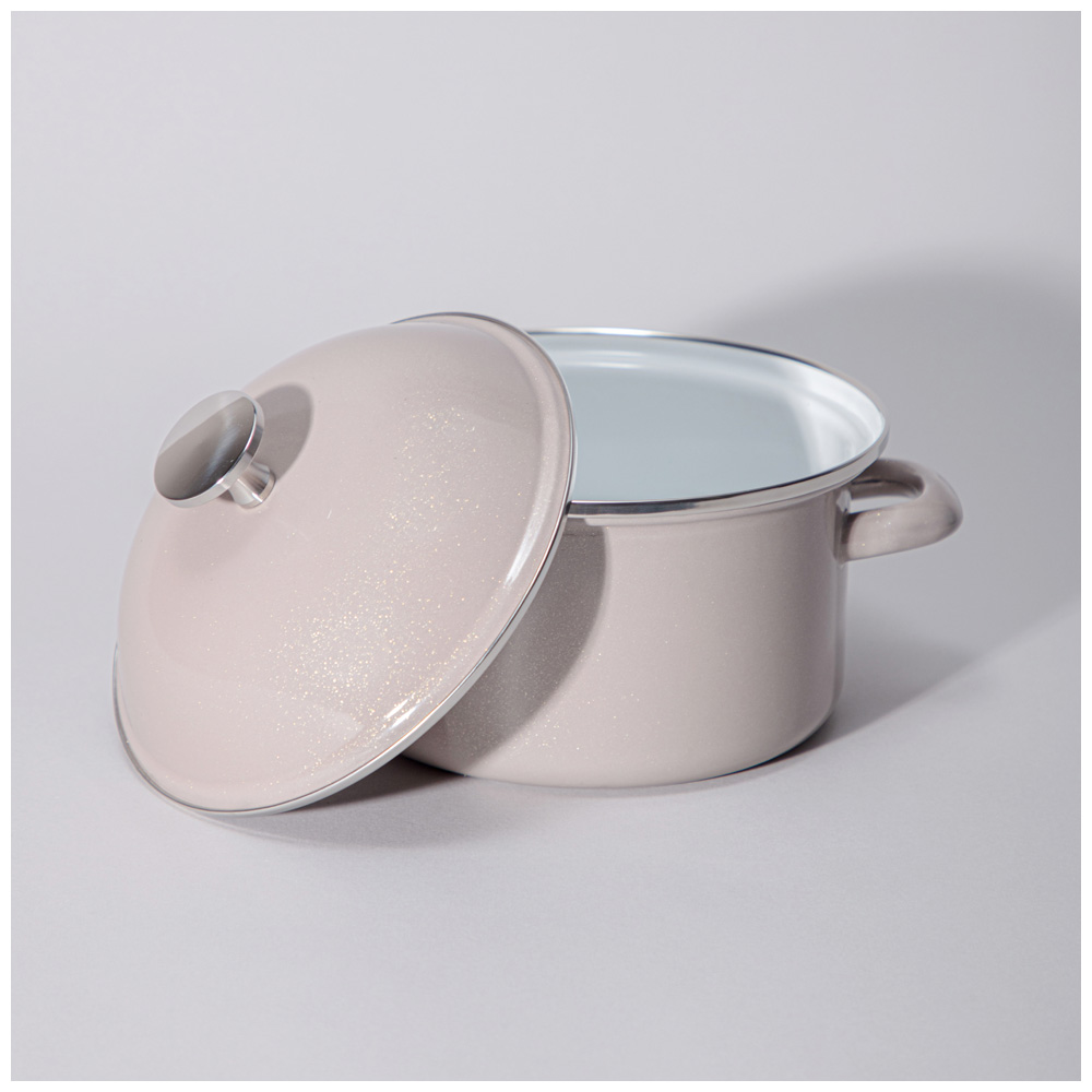 Толщина корпуса без эмалированного покрытия 0,7мм. 3-х слойное эмалированное покрытие - грунтовое, базовое и финишное покрытие с глиттером. Подходит для всех типов плит, включая индукционные. Можно мыть в посудомоечной машине.