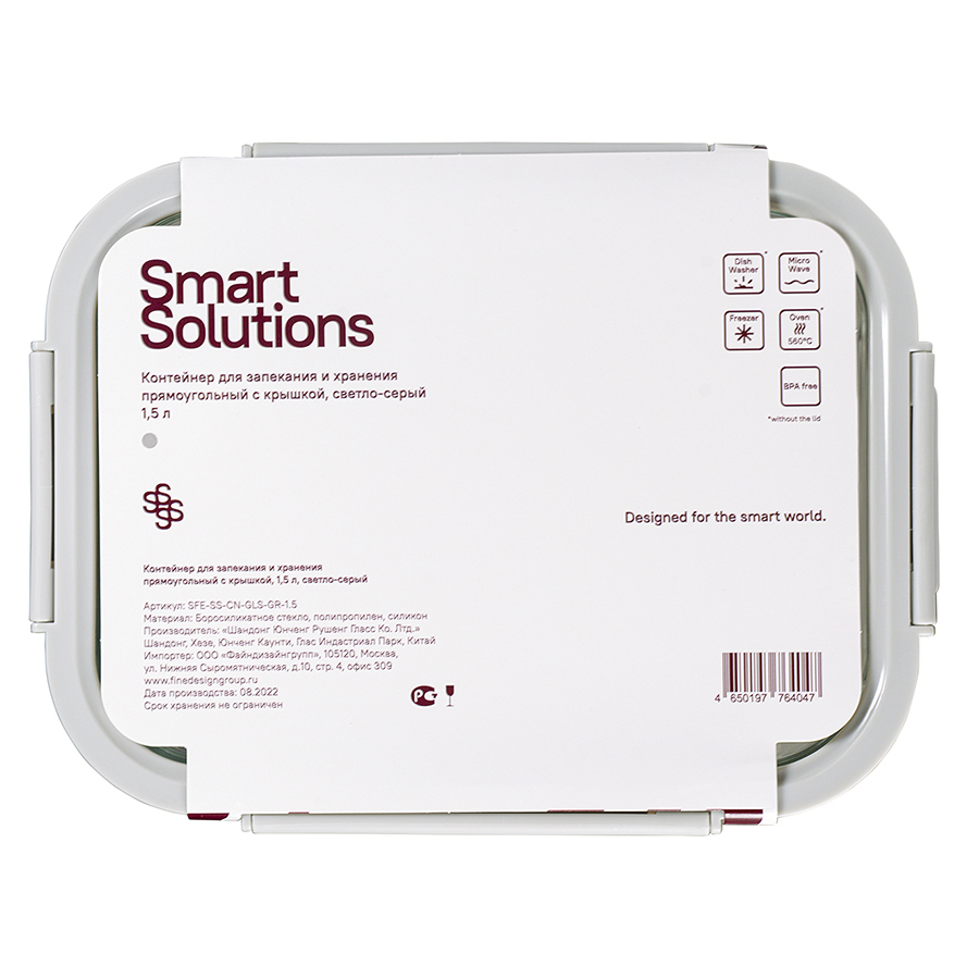 Материалы: боросиликатное стекло, полипропилен, силикон. Размеры: 18х23,5х8 см. Объем: 1,5 л. Цвет крышки: светло-серый.