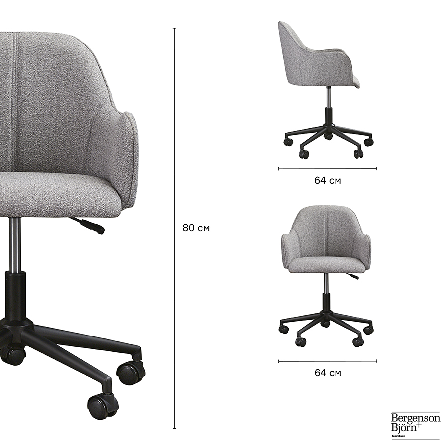 Материалы: 100% полиэстер, фанера, пенополиуретан, железо. Максимальная нагрузка: 130 кг. Размеры: 64x64x80 см. Высота сиденья: максимальная 51 см, минимальная 42 см. Ширина сиденья: 44 см. Глубина сиденья: 41 см. Высота спинки: 37 см. Ширина спинки: 40 см. Цвет: серый.