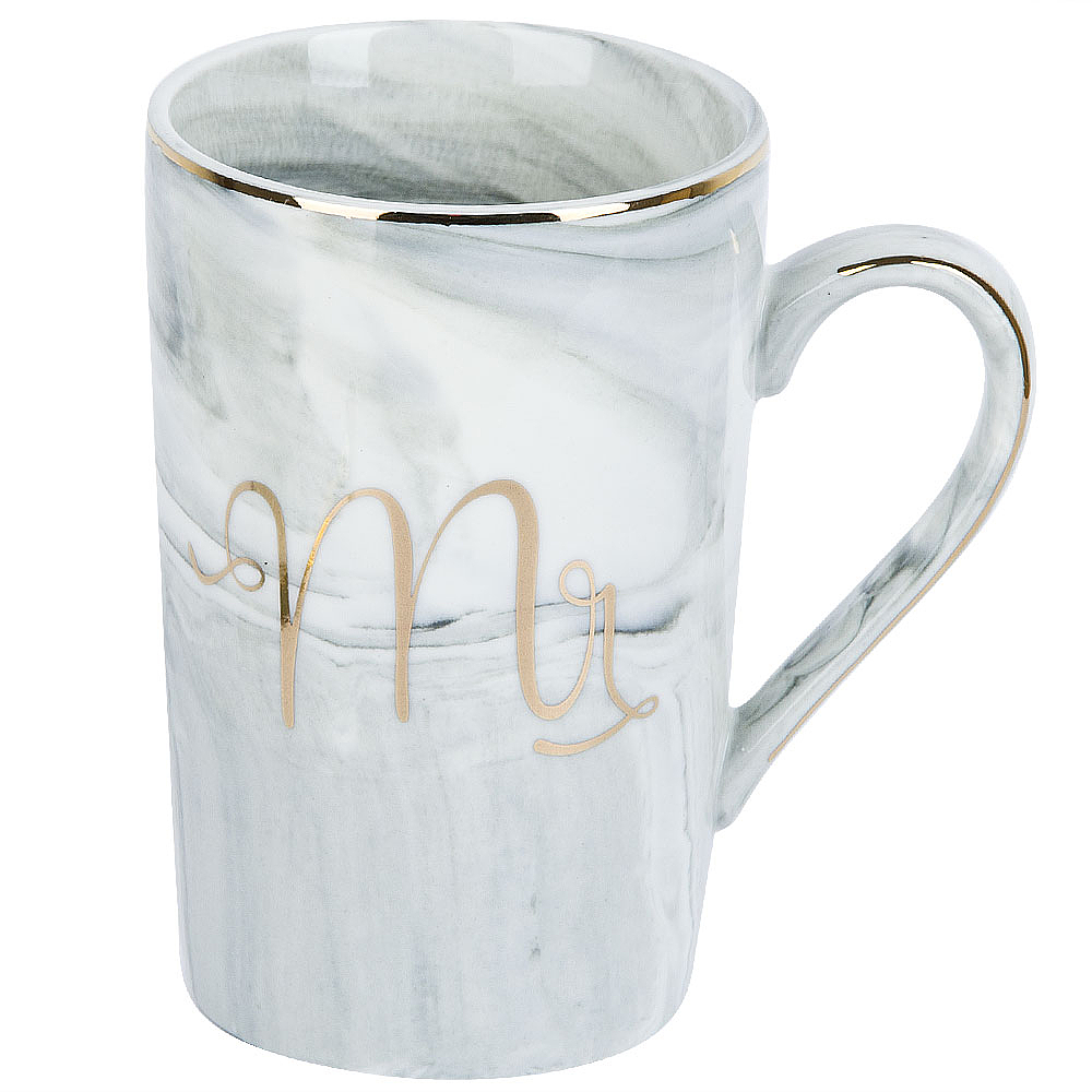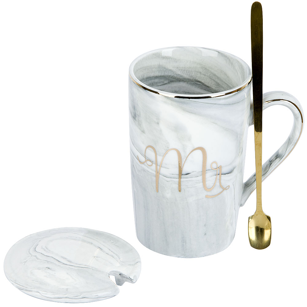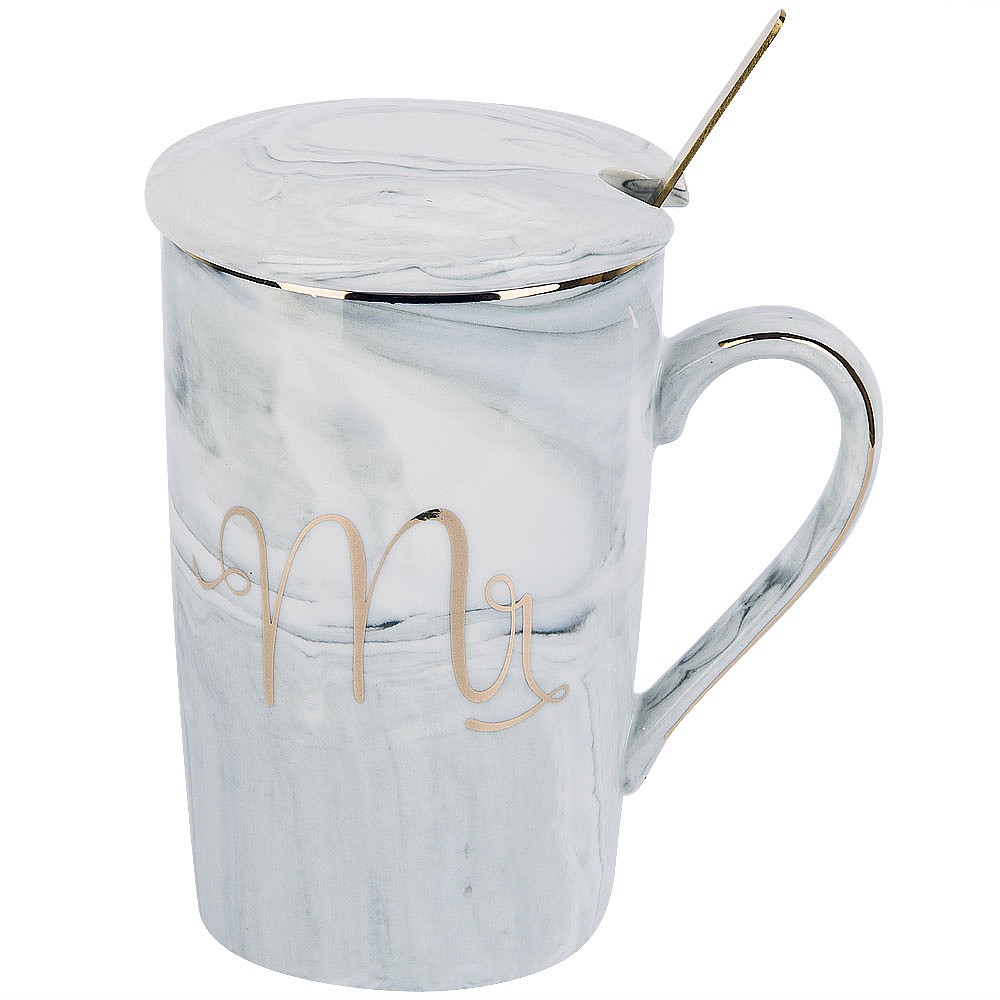 Кружка фарфоровая с крышкой и ложкой "Mr" (серая) v=380 мл (подарочная упаковка)
