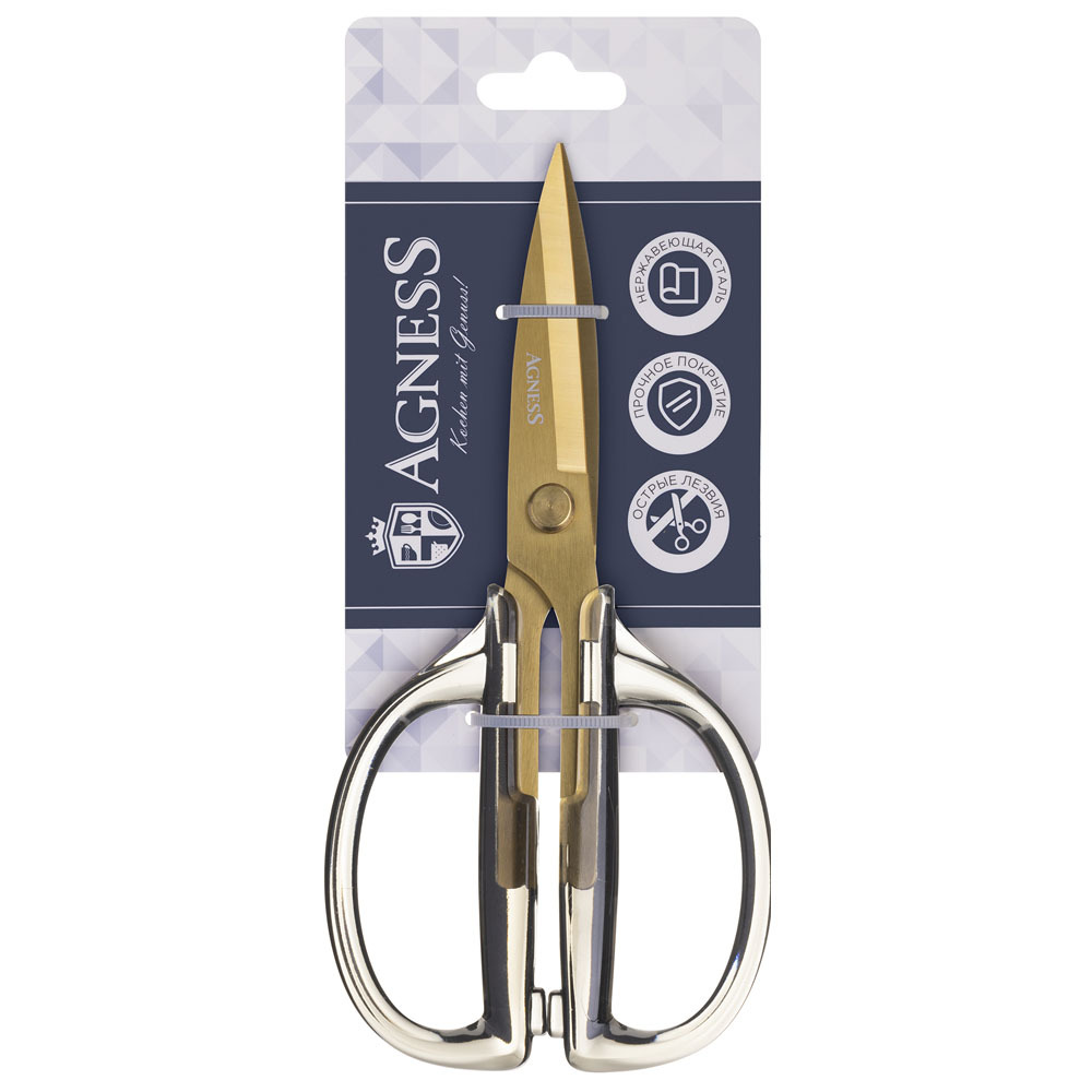 Многофункциональные разделочные ножницы для кухни изготовлены из высокопрочной нержавеющей стали. Тиатновое покрытиея лезвия надежно защищают метал от коррозии. Универсальные кухонные ножницы прекрасно режут бумагу, фольгу и идеально подойдут для вскрытия различных упаковок, нарезки зелени для салатов. Удобная рукоятка хорошо сидит в руке и не скользит.Такие кухонные ножницы станут хорошим помощником для любой хозяйки!