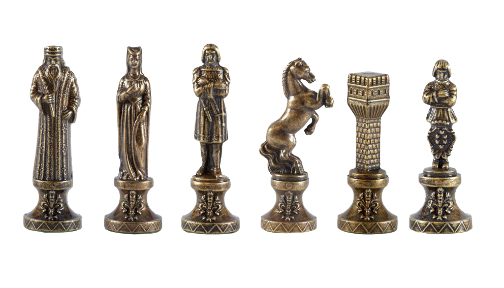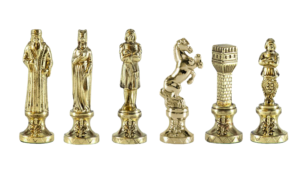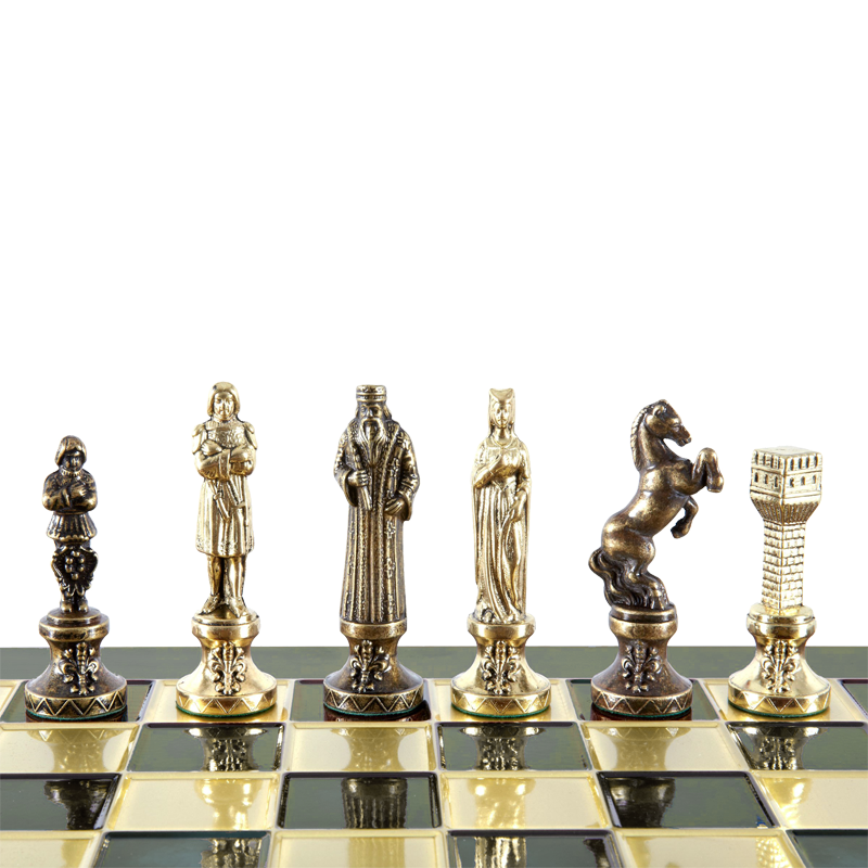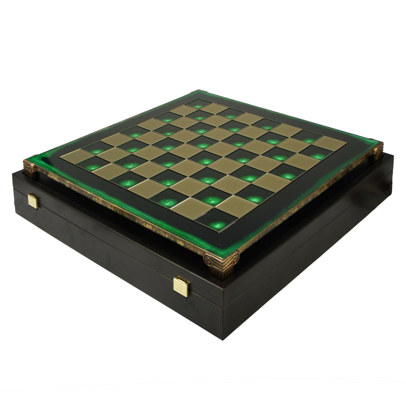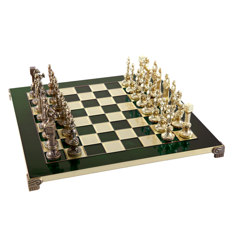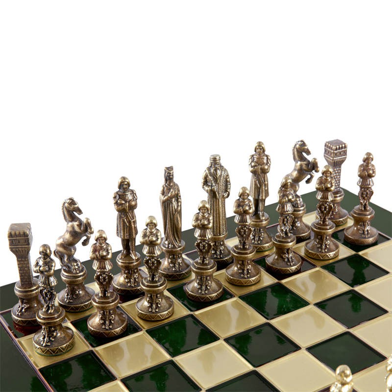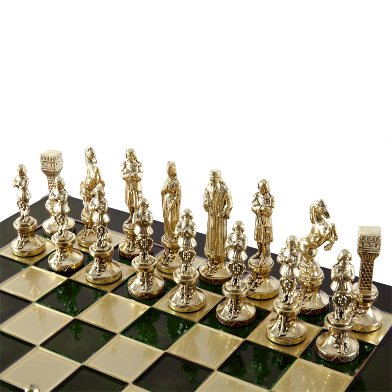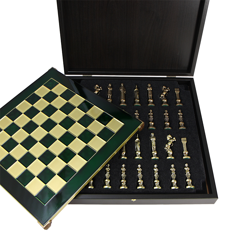 В этом наборе шахматная доска – зеленая; фигуры цвета золото и бронза.