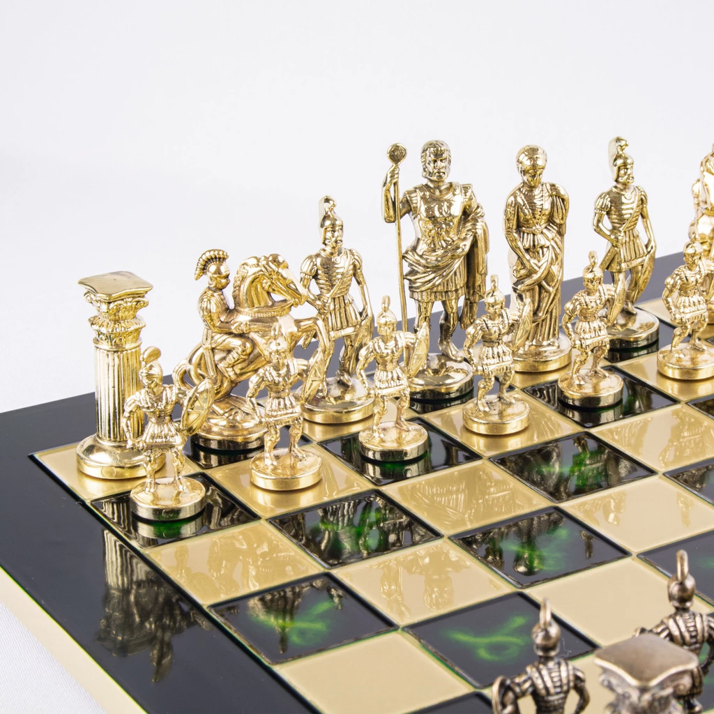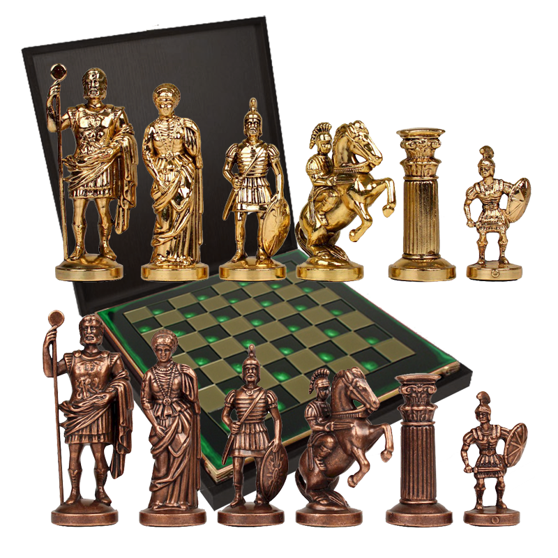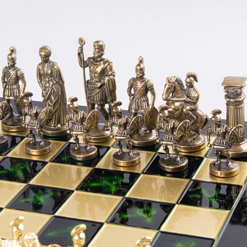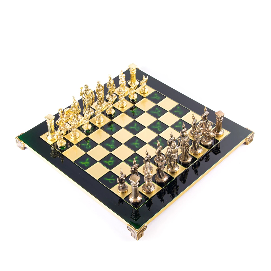 Шахматный набор "Греко-Романский Период" (зелен. мет. доска 28х28, дер. короб, фигуры золото/бронза)
