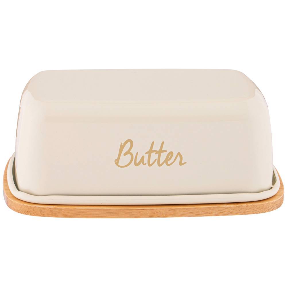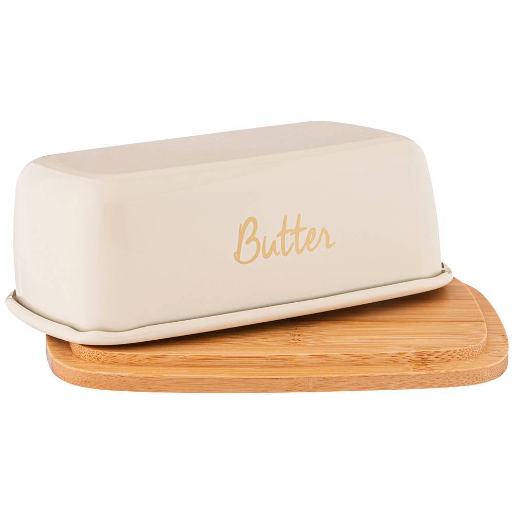 Основа масленки из натурального дерева. Стальная крышка достаточно плотно прилегает к основе, что позволяет защитить продукты от обветривания и проникновения посторонних запахов.